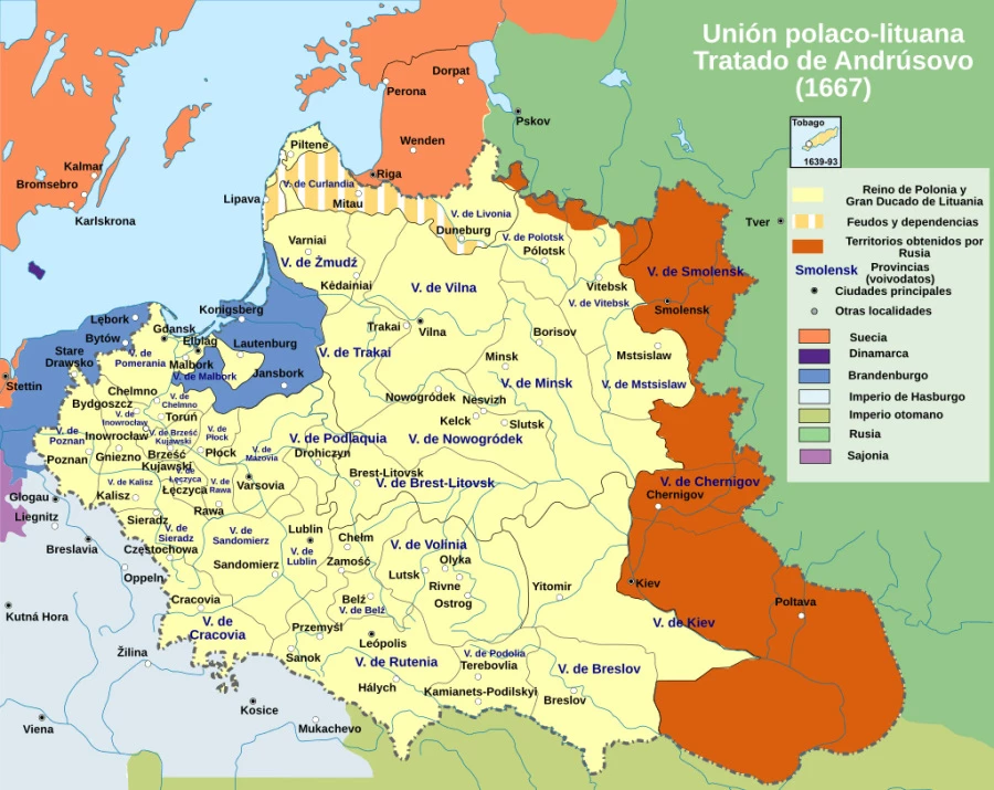 Die Polnisch-Litauische Union nach dem Vertrag von Andrussowo (1667). Das Gebiet auf der rechten Seite kam zu Moskau. (Arre Caballo)