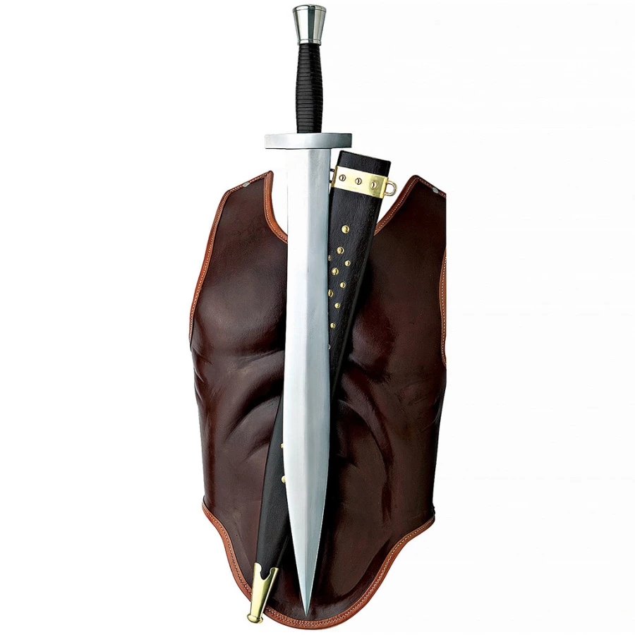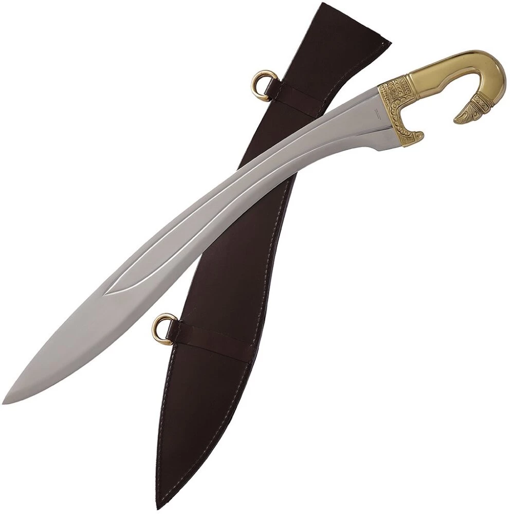 Griechisches Hoplitenschwert („Muskelpanzer“ im Hintergrund), 5. Jahrhundert v. Chr.