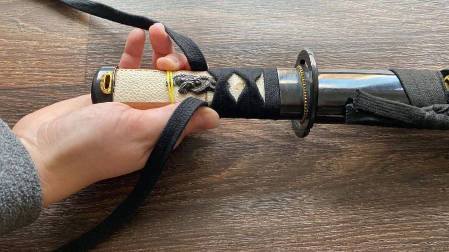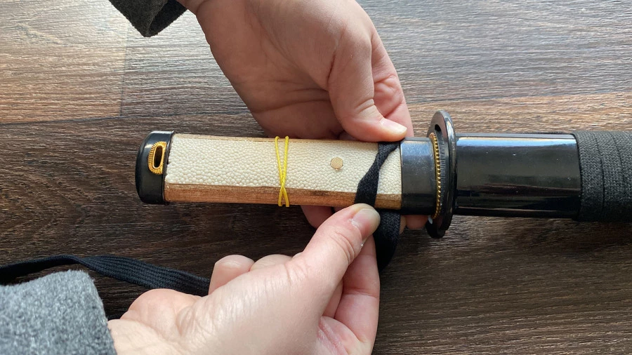 - Die Umwicklung darf beim Griff des Schwertes nicht im Weg sein. Das Band sollte am Griff fest sitzen, damit es sich beim Benutzen des Samurai-Katanas nicht löst.
