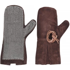Es gibt zwei Typen von Kettenhandschuhen - Kettenhandschuhe mit Fingern und frühere Fäustlinge. Diese tauchten erstmals im 12. Jahrhundert auf, im 13. und 14. Jahrhundert waren sie häufiger zu sehen. Damit der Ritter seine Finger benutzen konnte, ohne seine Rüstung ausziehen zu müssen, wurde manchmal ein Längsloch in der Handfläche des Kettenhandschuhs erzeugt. Auf diese Weise war es möglich, die Hand mühelos herauszunehmen.