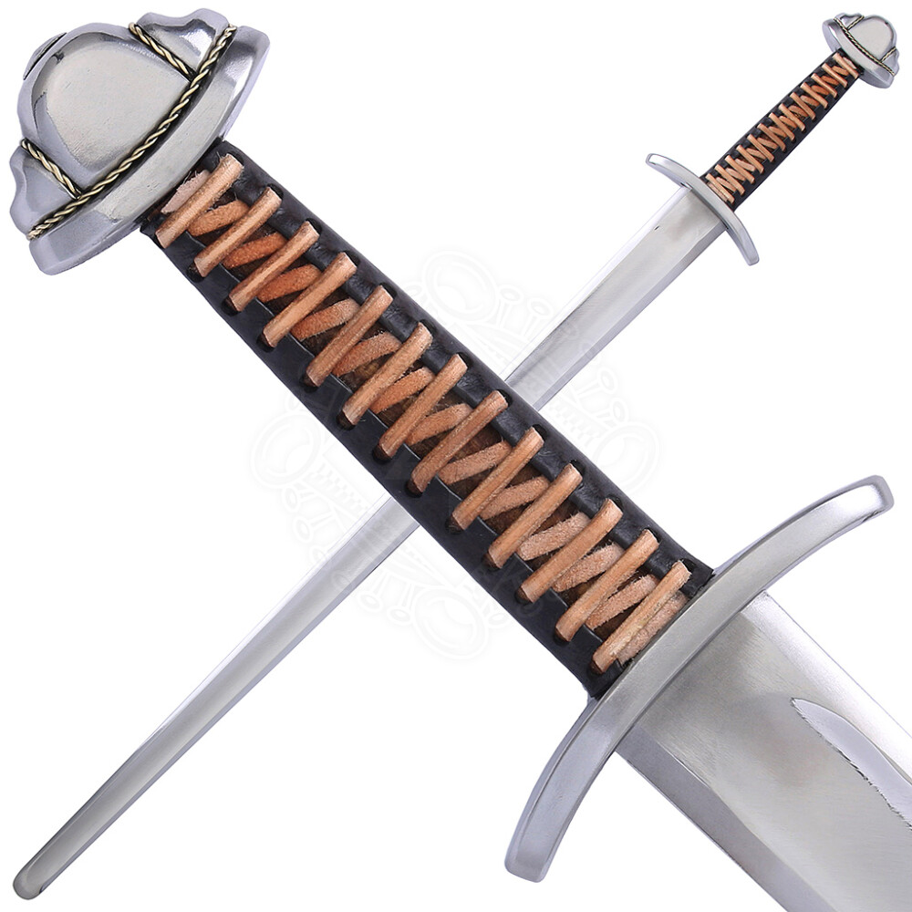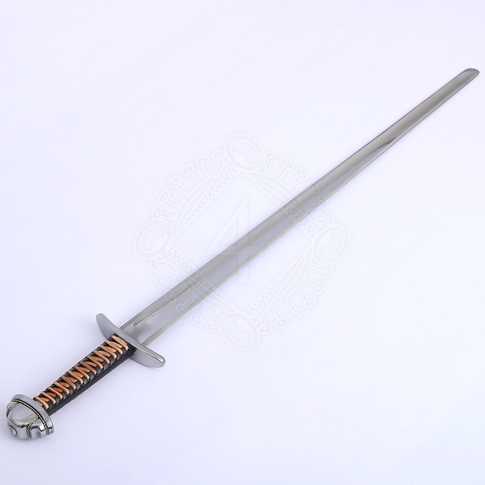 Diese germanische Spatha verfügt über eine ca. 47mm breite Klinge. Die Schneiden sind fast parallel, der Ort ist bei scharfer Ausführung geschärft, aber abgerundet. Wie es ab der Völkerwanderungszeit üblich war, ist auch die Klinge dieser Spatha mit einer einzigen breiten Hohlkehle auf beiden Seiten der Klinge versehen. Das Gefäß ist aus Stahl gefertigt und der Knauf ist mit Messing tauschiert. Weitere Produktinformationen ...