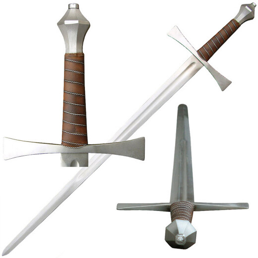 Die robuste Stahl-Parierstange ist gerade, 22,5 cm lang, und ihre Enden verbreitern sich leicht, was einen guten Schutz für die Hand bietet. Der Griff (Gefäß) mit einer Länge von 14,5 cm besteht aus der Angel der Klinge, die mit Holz verkleidet und mit festem Rindsleder sowie einem gedrehten Drahtpaar für einen sichereren Halt umwickelt ist. Abgeschlossen wird das Ganze durch einen eleganten, facettierten Stahlknauf in Birnenform mit einem Durchmesser von 5,3 cm, der das Schwert ausbalanciert und den Griff fest abschließt. Die Gesamtlänge des Schwertes beträgt 102 cm und sein Gewicht liegt bei 2096 g.