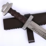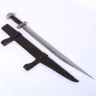 Der Parier und Knauf sind aus Stahl und der Holzgriff ist mit Bändern aus geschmeidigem braunem Leder überzogen. Die Scheide ist aus stabilem, dicht genähtem Leder mit integrierten Gürtelschlaufen gefertigt.