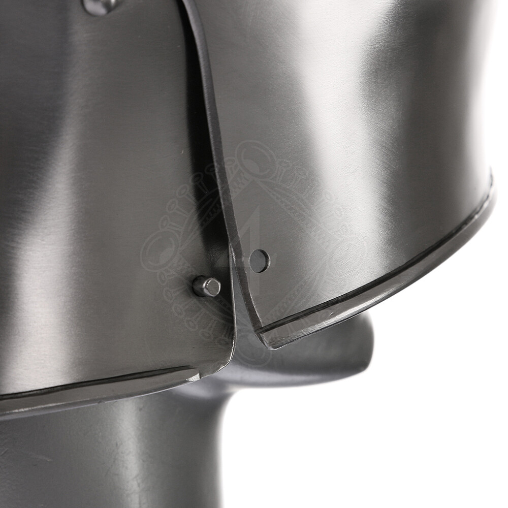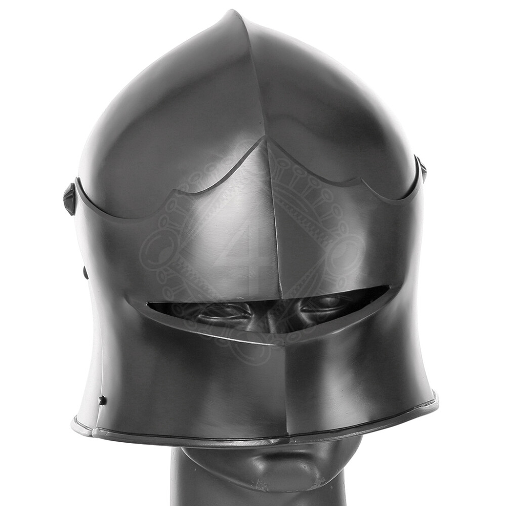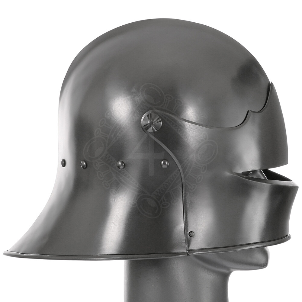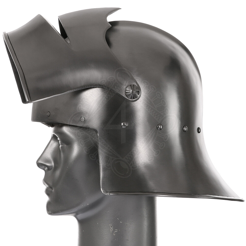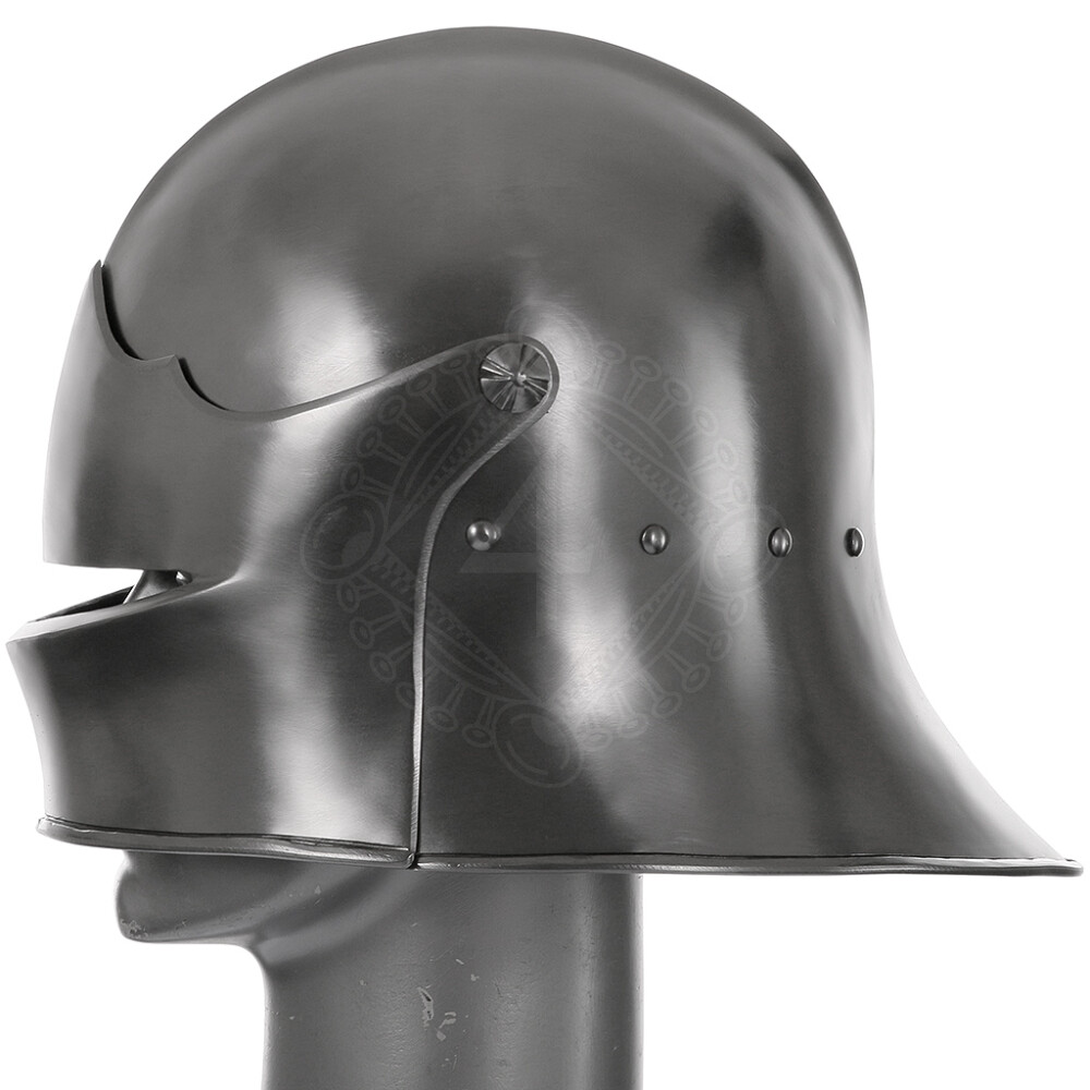Ein Schaller in seiner Höchstform mit der typische "S"-Kurve des Hinterteils der Helmglocke, wenn man sich ihn von der Seite ansieht. Diese Form des Schallers entspricht der vorletzten Dekade des 15. Jahrhunderts. Das einteilige Klappvisier deckt das gesamte Gesicht vom Kinn ab hoch. Die obere Kante des Visiers ist elegant wellenförmig ausgeschnitten und liegt in der geschlossenen Position eng an die Vorderseite der Helmglocke an. Der Sehschlitz im Visier ist von ausreichender Größe und bietet ausreichende Aussicht. Die untere Kante der Glocke und des Visiers ist mit glatter Bördelung verstärkt. Das Vollvisier ist in der eingeklappten Position mit einem Stahlbolzen auf Feder verriegelt und kann z.B. beim Laufen nicht spontan öffnen. Die Köpfe der Bolzen, auf denen das Visier gelagert ist, sind dekorativ eingekerbt. Hochwertige Handarbeit eines tschechischen Plattner-Meisters. Weitere Produktinformationen ...