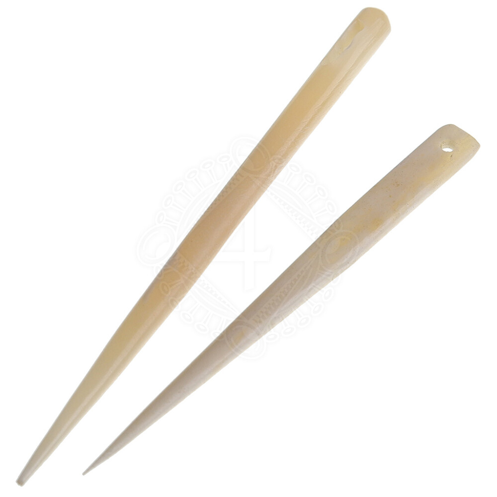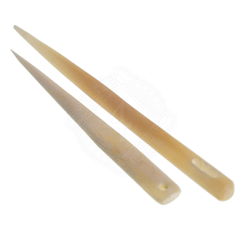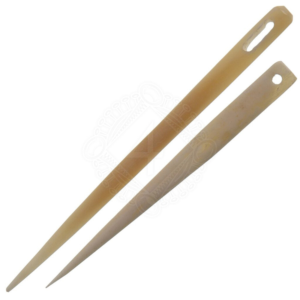 - Die ca. 9cm lange größere Nähnadel ist aus festem Knochen gefertigt und hat ein ovales Nadelöhr, das für glatte Fäden wie Wolle besser geeignet ist als runde Löcher.