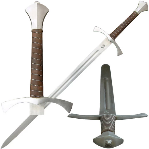 Die 22 cm breite Parierstange aus Stahl entspricht dem Oakeshott-Stil 7 – ihre Arme sind stark zur Klinge hin gebogen und bieten so einen hervorragenden Schutz für die Hände. Der lange Griff (20,5 cm) ermöglicht einen bequemen ein- oder beidhändigen Halt. Sein Holzkern ist mit hochwertigem Leder überzogen und mit einer spiralförmigen Drahtwicklung verstärkt, die auch mit Handschuhen einen sicheren Griff gewährleistet. Das imposante Gesamtbild wird durch einen massiven Stahlknauf in „Fischschwanz“-Form abgerundet, der als Oakeshott-Typ V klassifiziert ist und das Schwert perfekt ausbalanciert. Der Schwerpunkt liegt nur 3 cm von der Parierstange entfernt, was eine hervorragende Handhabbarkeit garantiert.