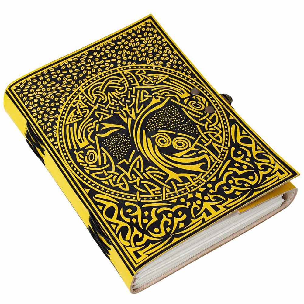 Der Einband besteht aus hochwertigem, geschmeidigem und dennoch strapazierfähigem Leder, das in einem satten Gelbton gefärbt ist. Die detaillierte Prägung des Lebensbaums und der zusätzlichen Muster ist mit höchster Präzision ausgeführt und mit schwarzer Farbe hervorgehoben, was einen atemberaubenden visuellen Kontrast schafft. Der Buchrücken ist mit einer sichtbaren Kreuzstich-Bindung aus schwarzem Faden verziert.
