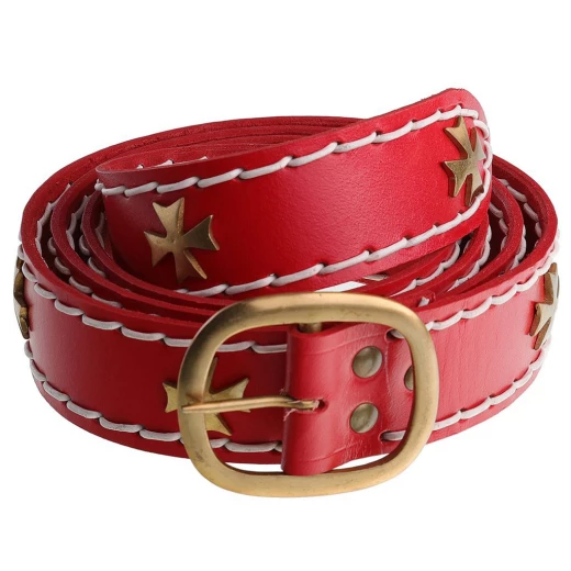 Der robuste Ledergürtel ist aus 3mm dickem, rot vegetabil gegerbtem Leder gefertigt. Mit einer Riemenbreite von ca. 43mm kann er auch als Schwertgürtel verwendet werden. Der Gürtel verfügt außerdem über eine Ziernaht aus weißem Leder-Rundriemen.