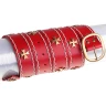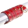 - Das rote Leder ist mit einem festen Rundriemen in weißer Farbe egesäumt