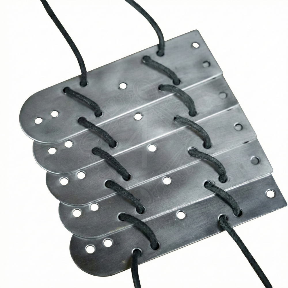 Die Lamellen sind mit Löchern von ca. 4 mm Durchmesser versehen. Diese dienen zum Durchfädeln von Lederriemen oder starken Schnüren, mit denen die Plättchen aneinandergebunden werden. Das Bindesystem ist variabel, aber wir empfehlen, die historischen Bindemuster aus Birka zu studieren, damit die Rüstung funktional und stabil wird. Bitte beachte, dass das Bindematerial (Leder, Schnüre) nicht im Lieferumfang enthalten ist.