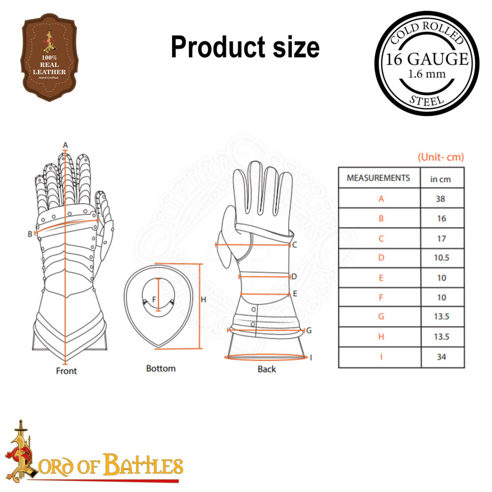 Die Handschuhe sind aus ca. 1,6 mm starkem Baustahl (16 Gauge) gefertigt, was sie besonders widerstandsfähig macht. Im Inneren sorgt ein fest vernähter Handschuh aus weichem Wildleder für Tragekomfort und sicheren Halt. Die Stulpe ist, typisch für die Epoche, weit und lang ausgeformt, um das Handgelenk und den Unterarm optimal zu schützen, ohne die Beweglichkeit einzuschränken.