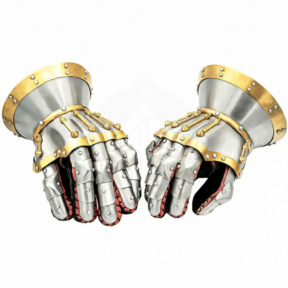 Die Handschuhe sind aus 1,6 mm starkem Baustahl (16 Gauge) gefertigt, was eine ausreichende Stärke für die meisten Vollkontakt-Kampfaktivitäten wie SCA oder HMB darstellt. Die Oberfläche ist poliert und kontrastiert mit Messingbordüren und Nieten, was den Handschuhen einen Hauch von Luxus verleiht. Auf den Fingerknöcheln findest du kleine Messingdornen (sogenannte Gadlings), die historisch als Notfallwaffe im Nahkampf dienten.