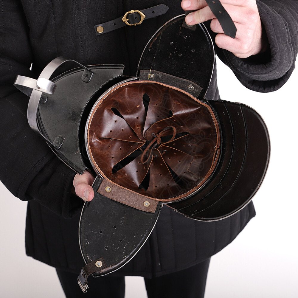 Sicherheitshinweis: Dies ist eine Replik für Reenactment, LARP und Kostümzwecke. Mit einer Materialstärke von 1,2 mm ist der Helm nicht für den Vollkontakt-Kampf (wie Buhurt oder Battle of the Nations) geeignet. Schwere Schläge mit Stahlwaffen könnten das Material verformen und zu Verletzungen führen.