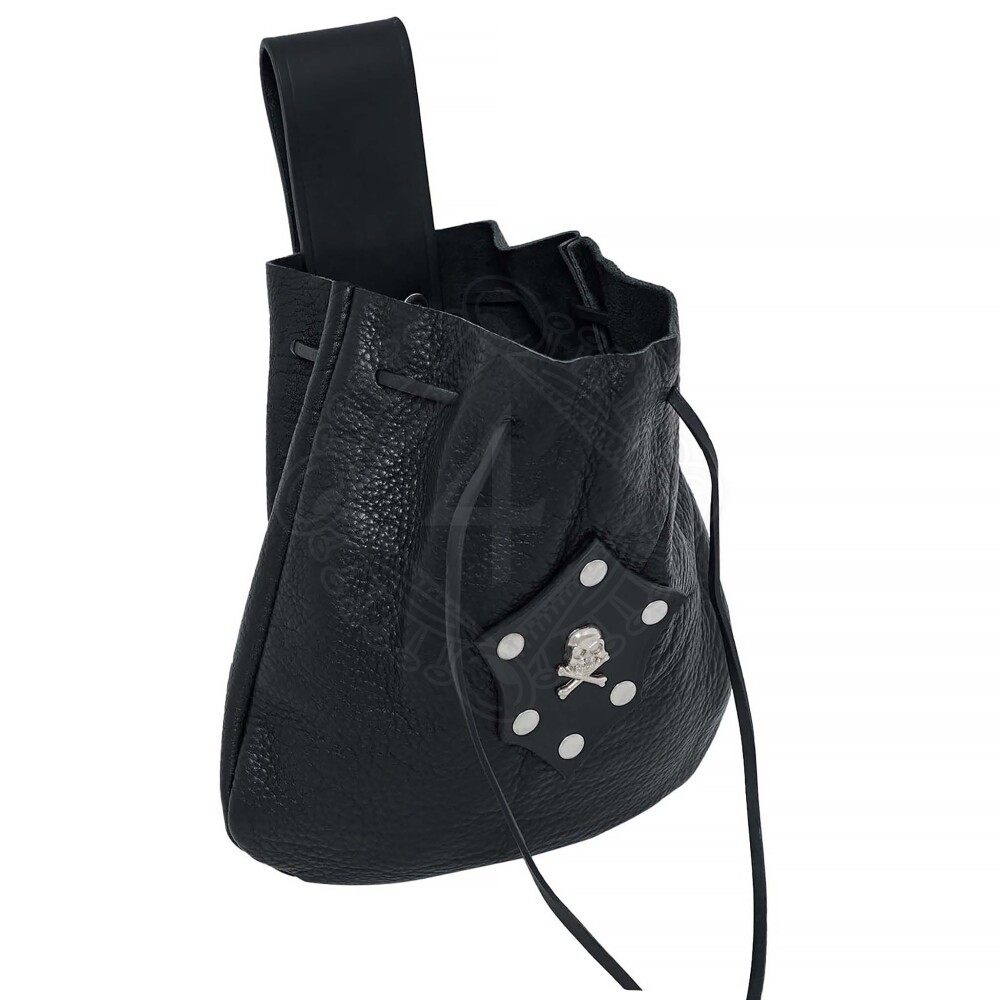 Der Beutel ist aus echtem, angenehm griffigem Leder in elegantem Schwarz gefertigt. Ein silbernes Piraten-Emblem mit Totenkopf und gekreuzten Knochen ist das Highlight und verleiht dem Beutel den richtigen "Piraten-Flair". Der Beutel hat die Form eines Geldbeutels, der mit einer Lederschnur zusammengezogen wird, und bewahrt so Deine Wertsachen sicher auf. Auf der Rückseite findest Du eine robuste Lederschlaufe, mit der Du den Beutel einfach an Deinem Gürtel befestigen kannst.
