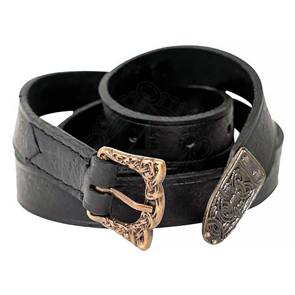 - Authentische Verzierung: Entlang des gesamten Gürtels verläuft eine feine Prägung, und die patinierten Messingbeschläge sind mit komplexen keltischen oder nordischen Knoten verziert, die auf die Kunst des 10. Jahrhunderts verweisen.