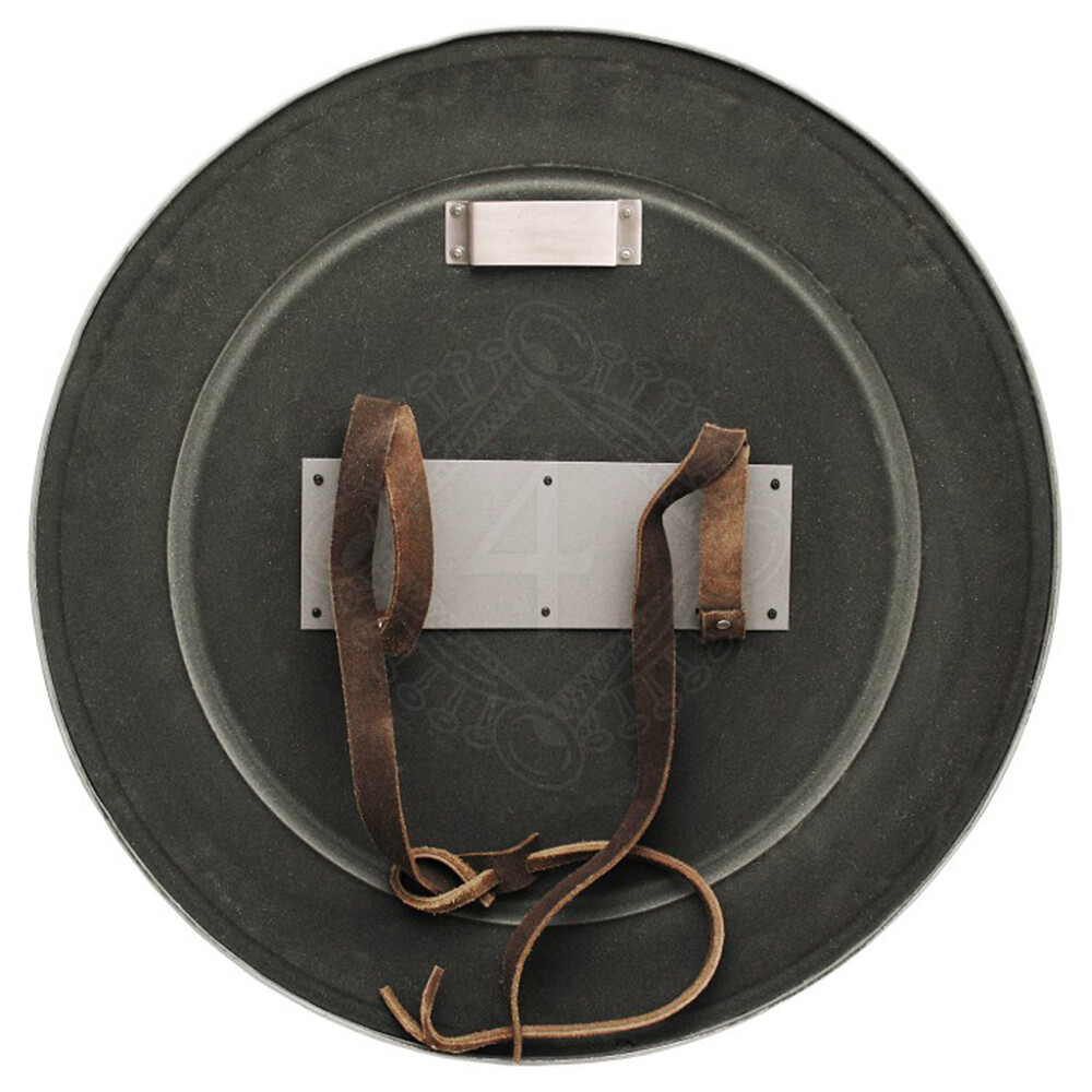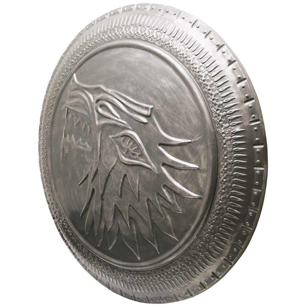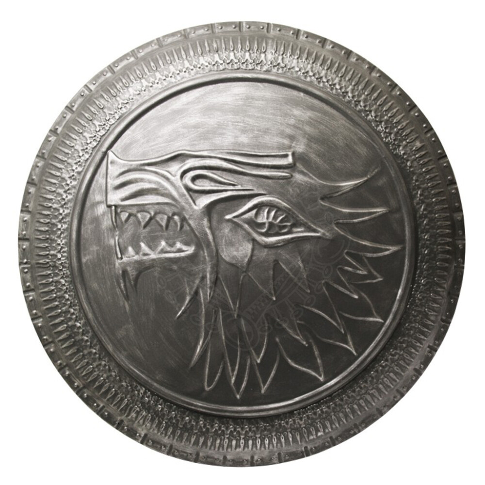 Diese Nachbildung vom Schild der Stark-Infanterie ist eine offiziell lizensierte, aufwändig gearbeitete Reproduktion des echten Requisits aus der epischen HBO Fantasy-TV-Dramaserie Game of Thrones®. Dieses Sammlerstück wurde mit größter Liebe zum Detail gefertigt und es wurde keine Mühe gescheut, um alle Besonderheiten des originalen Requisits möglichst detailgetreu zu replizieren. Dieser Rundschild ist aus kaltgewalztem Stahl gefertigt. Eine Stark-graue Lackierung verleiht der Oberfläche eine abgenutzte Optik. Der Schild ist mit einer Reliefprägung des Schattenwolf-Wappens vom Haus Stark verziert und rückseitig mit Lederriemen ausgestattet.