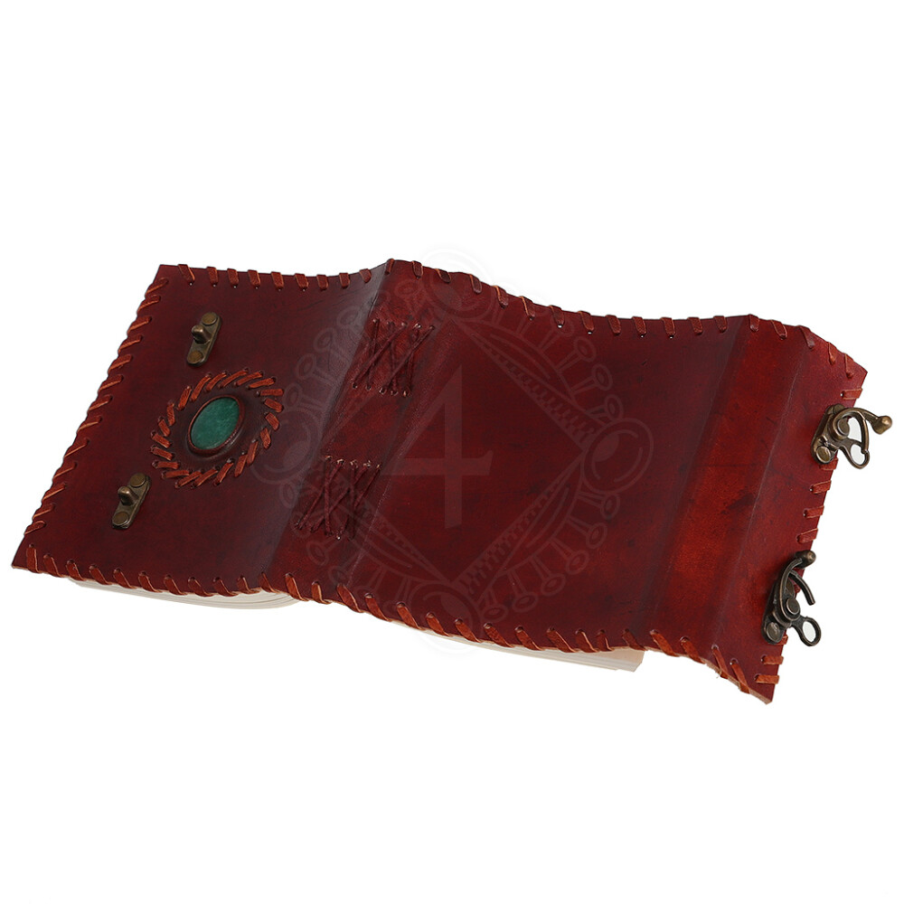 Der Einband besteht aus echtem Rindsleder in einem satten Braunton. Das Leder ist mit einer markanten Naht am Rand und um den zentralen ovalen Stein in grüner Farbe verziert. Zwei robuste Metallverschlüsse aus patiniertem Messing sorgen für einen sicheren Verschluss.