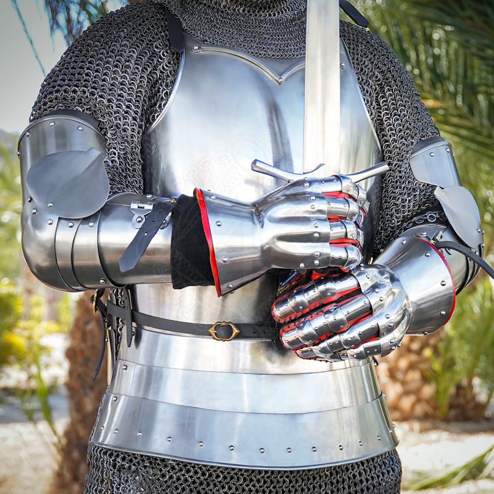 Versetze dich zurück in die Zeit des Hundertjährigen Krieges, in die Ära des Schwarzen Prinzen und der großen Turniere. Diese Stundenglas-Panzerhandschuhe (Hourglass Gauntlets) sind ein meisterhaftes Beispiel für die Waffenschmiedekunst der zweiten Hälfte des 14. Jahrhunderts. Sie wurden für diejenigen entworfen, die keine Kompromisse zwischen Schutz und Beweglichkeit eingehen wollen. Egal, ob du dich auf ein historisches Reenactment, eine LARP-Schlacht vorbereitest oder ein dominantes Element für dein Ritterkostüm suchst, diese Handschuhe bieten dir nicht nur ein authentisches Aussehen, sondern auch ein Gefühl der Sicherheit, wenn du den Griff deines Schwertes umklammerst. Weitere Produktinformationen ...