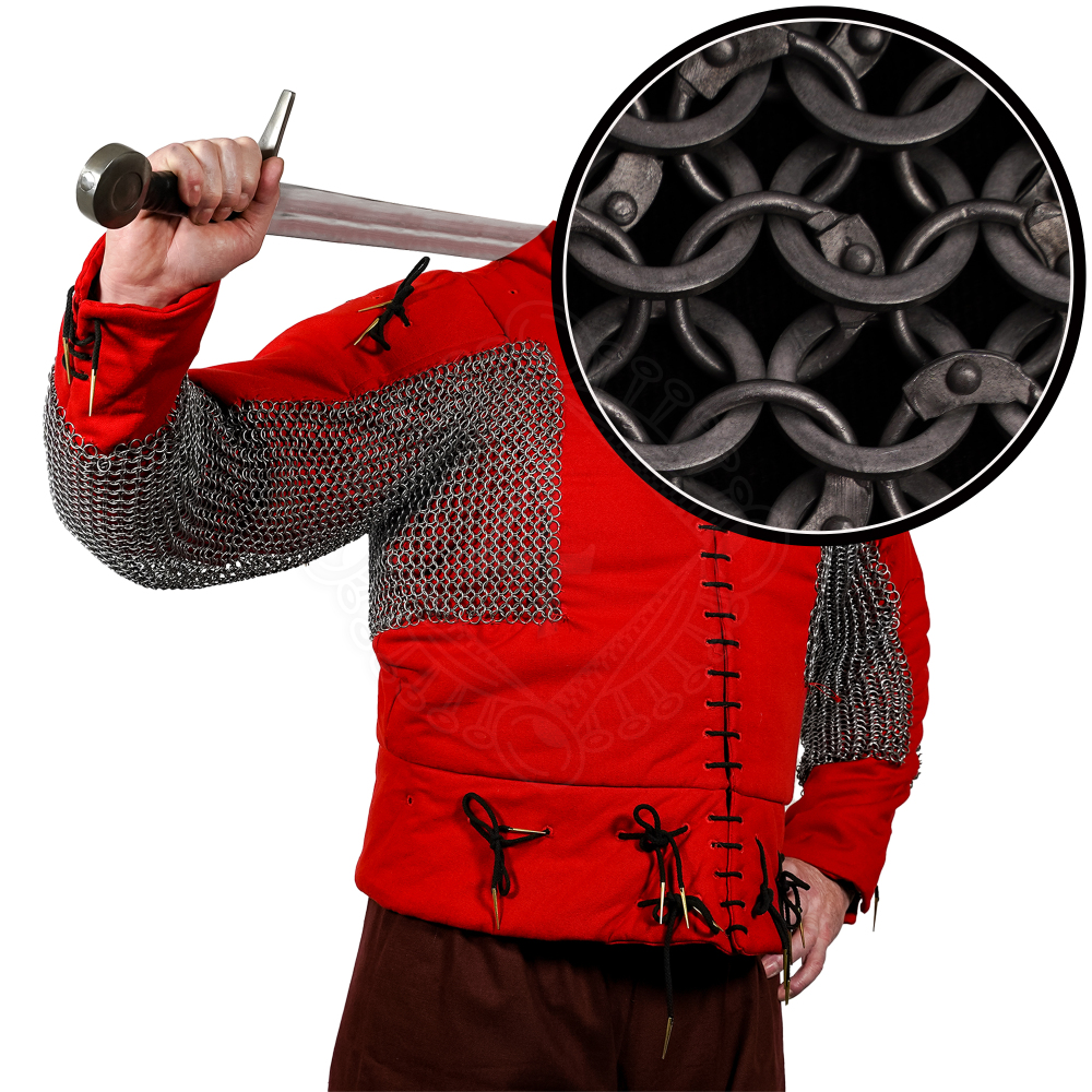 Sichere die kritischen Stellen deiner Plattenrüstung und erhöhe deine Überlebenschancen im Schlachtgetümmel mit diesen geschwärzten Kettenzwickeln (Voiders)! Sie sind sorgfältig handgefertigt aus widerstandsfähigem Baustahl, bei dem sich meisterhaft Reihen von Rundringen (Innendurchmesser 9 mm, Drahtstärke 1 mm / 18 Gauge), mit robusten Rundkopfnieten vernietet, mit Reihen massiver Flachringe abwechseln. Diese Voiders sind speziell zum Annähen an deinen Gambeson oder Polsterwams konzipiert und bieten so gezielten Schutz für verwundbare Bereiche wie Achselhöhlen und Flanken, ohne deine Beweglichkeit und Agilität im Kampf einzuschränken. Weitere Produktinformationen ...