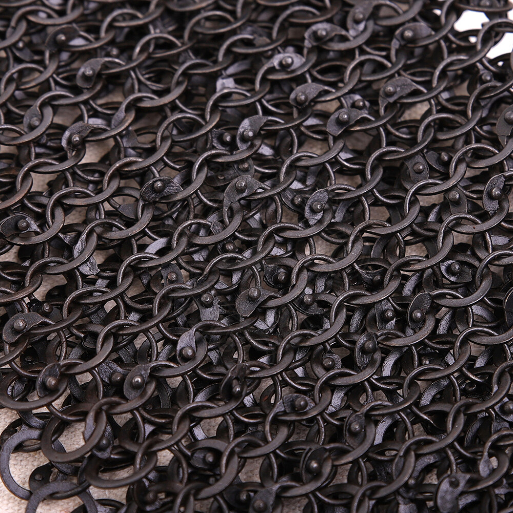 Die Voiders sind aus ungehärtetem Baustahl mit einer Drahtstärke von 1 mm (entspricht 18 Gauge) gefertigt und mit einer eleganten geschwärzten Oberfläche versehen. Diese Schwärzung verleiht der Rüstung nicht nur ein bedrohliches Aussehen, sondern bietet auch einen grundlegenden Schutz gegen Korrosion. Die einzigartige und bewährte Konstruktion des Kettengeflechts, bei der sich Reihen von Rundringen (jeder einzelne sorgfältig und fest mit einer widerstandsfähigen Rundkopfniete vernietet) mit Reihen massiver Flachringe abwechseln, ist außerordentlich widerstandsfähig und effektiv. Die Nietverbindungen stellen sicher, dass sich die Ringe auch bei starker Beanspruchung oder Treffern nicht öffnen, während die Flachringe die Dichte des Geflechts erhöhen. Der Innendurchmesser der Ringe von 9 mm und das 4-in-1-Flechtmuster bilden eine zuverlässige Schutzschicht für empfindliche Bereiche.
