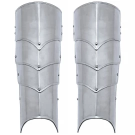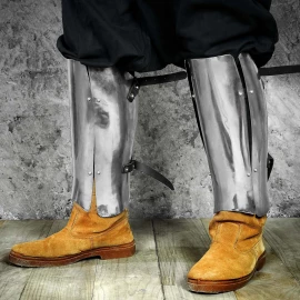 Der Beinschutz war für Fußsoldaten seit der Antike unverzichtbar. Im Mittelalter tauchten Plattenrüstungen für die Beine im 13. und 14. Jahrhundert wieder auf. Dieses Modell orientiert sich optisch an spätmittelalterlichen Rüstungen, bei denen Schienbeinschutz und Kniebuckel (Poleyn) kombiniert wurden. Die starre Verbindung ohne Gelenk ist jedoch ein Zugeständnis an die moderne Fertigung für Kostümzwecke und bietet eine kostengünstige Alternative zu maßgefertigten Plattnerarbeiten.