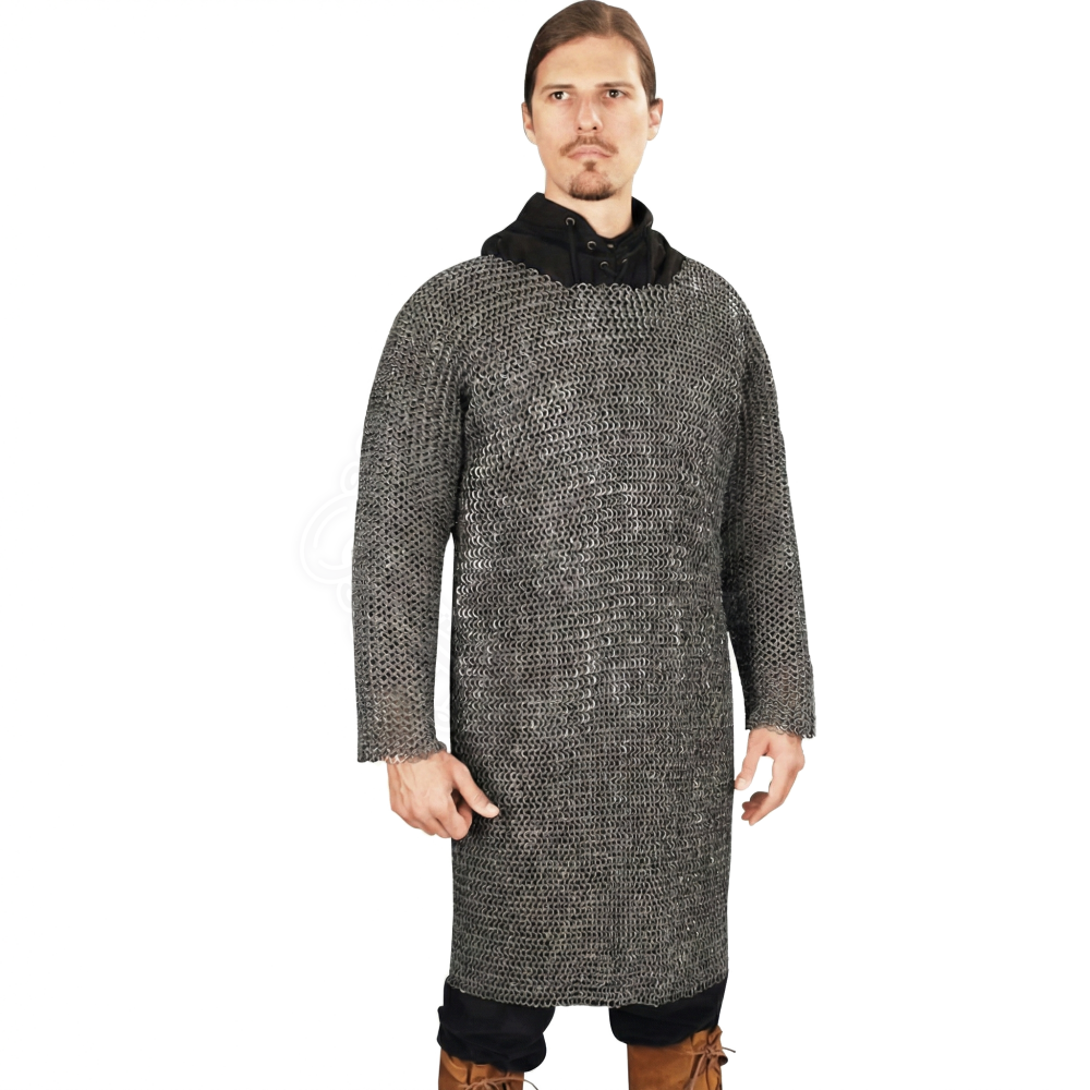 Das Besondere an diesem Hemd ist die Kombination aus Material und Verarbeitung. Es besteht aus flachen, vernieteten Aluminiumringen. Im Gegensatz zu einfachen, nur gebogenen Aluminiumringen, bietet die Vernietung eine deutlich höhere Stabilität und verhindert, dass sich die Ringe bei Bewegung öffnen. Der Außendurchmesser der Ringe beträgt ca. 12,5 mm. Die dunkelgraue Patina sorgt für einen realistischen Look ohne den künstlichen Glanz von unbehandeltem Aluminium.
