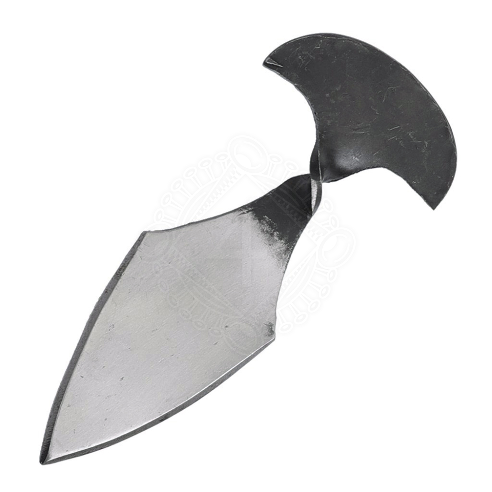 • Griff: Der T-förmige Griff ist so gestaltet, dass er perfekt in der geballten Hand liegt und die Finger ihn fest umschließen können. Seine Oberfläche wurde im rohen, schwarzen Zustand nach dem Schmieden belassen, was ihm ein raues und historisches Aussehen verleiht.
