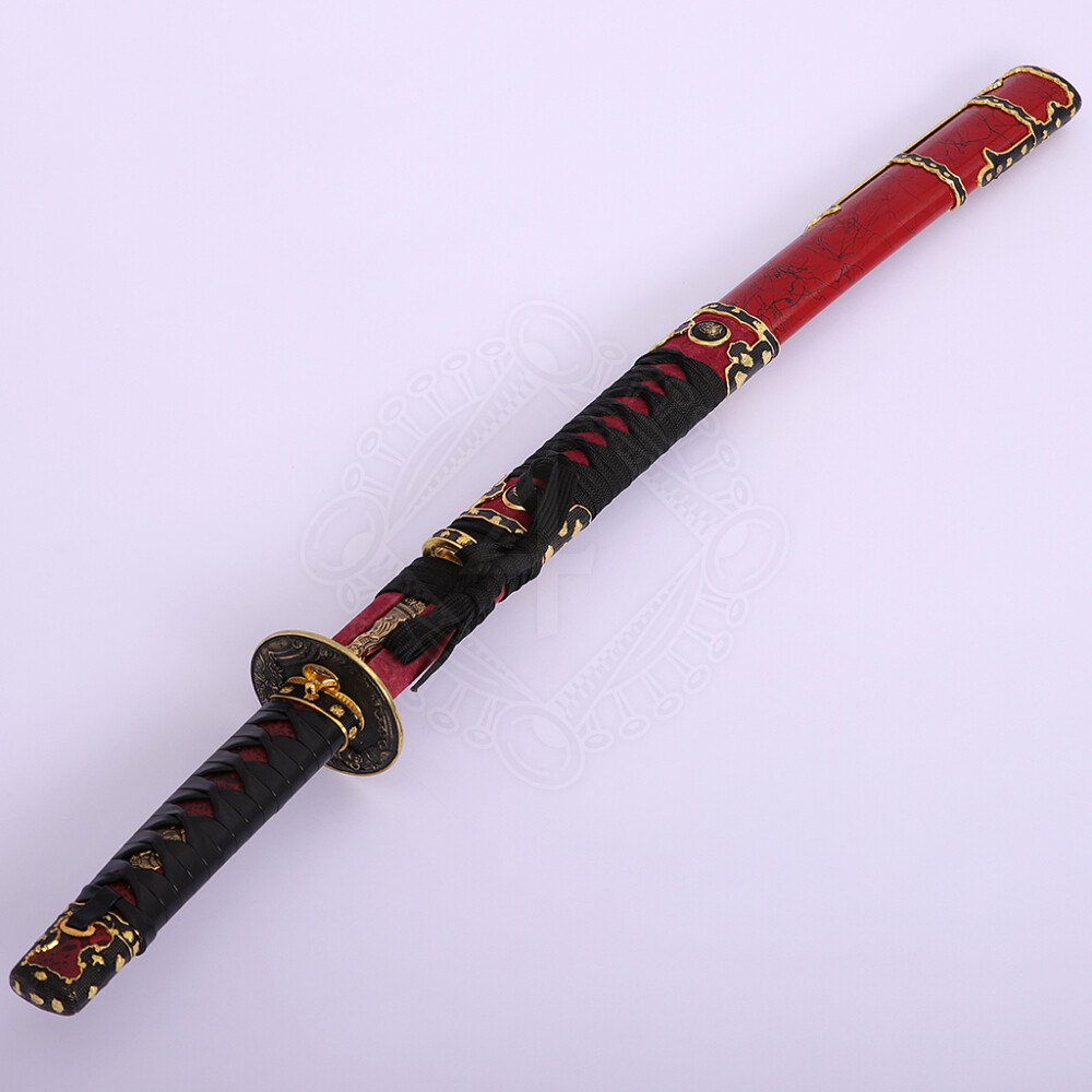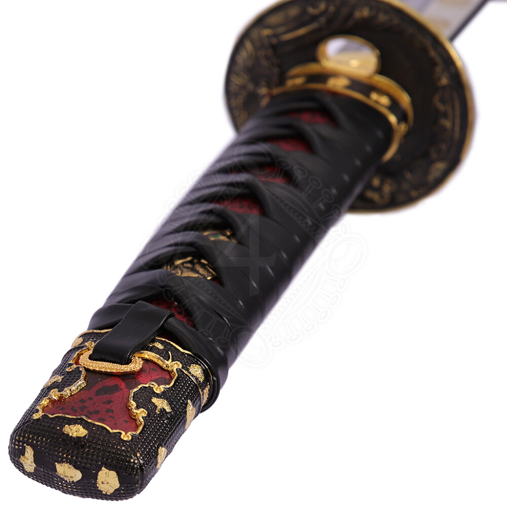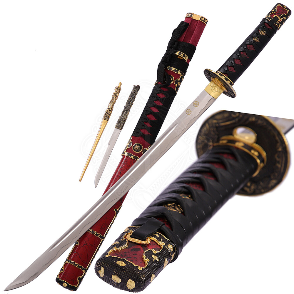 Dekorative Wakizashi mit Scheide mit rotem Lack-Finish, gewickelt in schwarzer Baumwolle und Lederband.