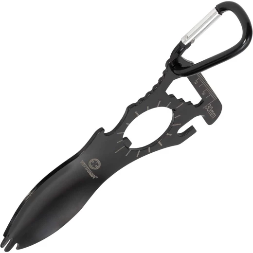 Komplett aus 420 rostfreiem Stahl gefertigt und schwarz beschichtet. Er kann als Löffel, oder Gabel benutzt werden. Mit zwei Flaschenöffnern, vier Schlüsselweiten mit Karabiner. Weitere Produktinformationen ...