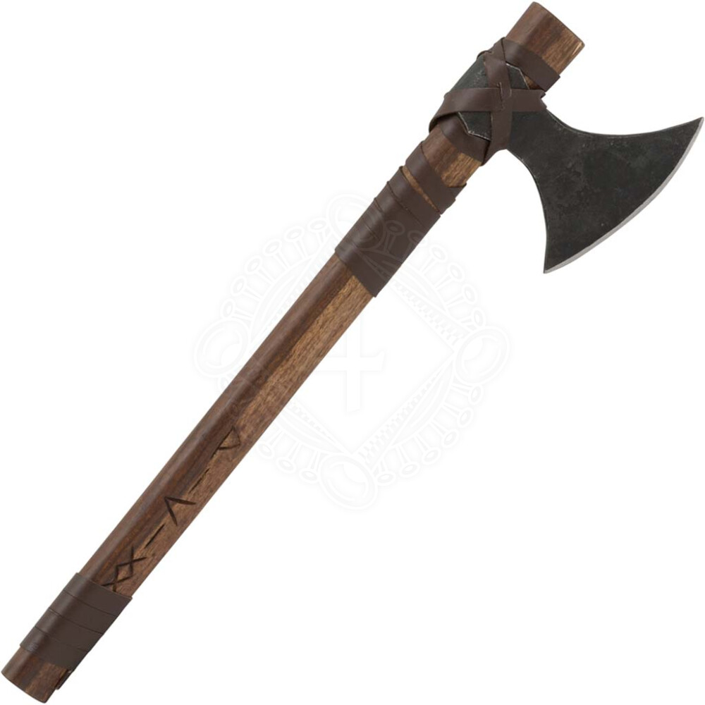 In den hölzernen Stil sind Runenzeichen eingeschnitzt, seine Griffpartie ist mit Rindsleder umgewickelt.