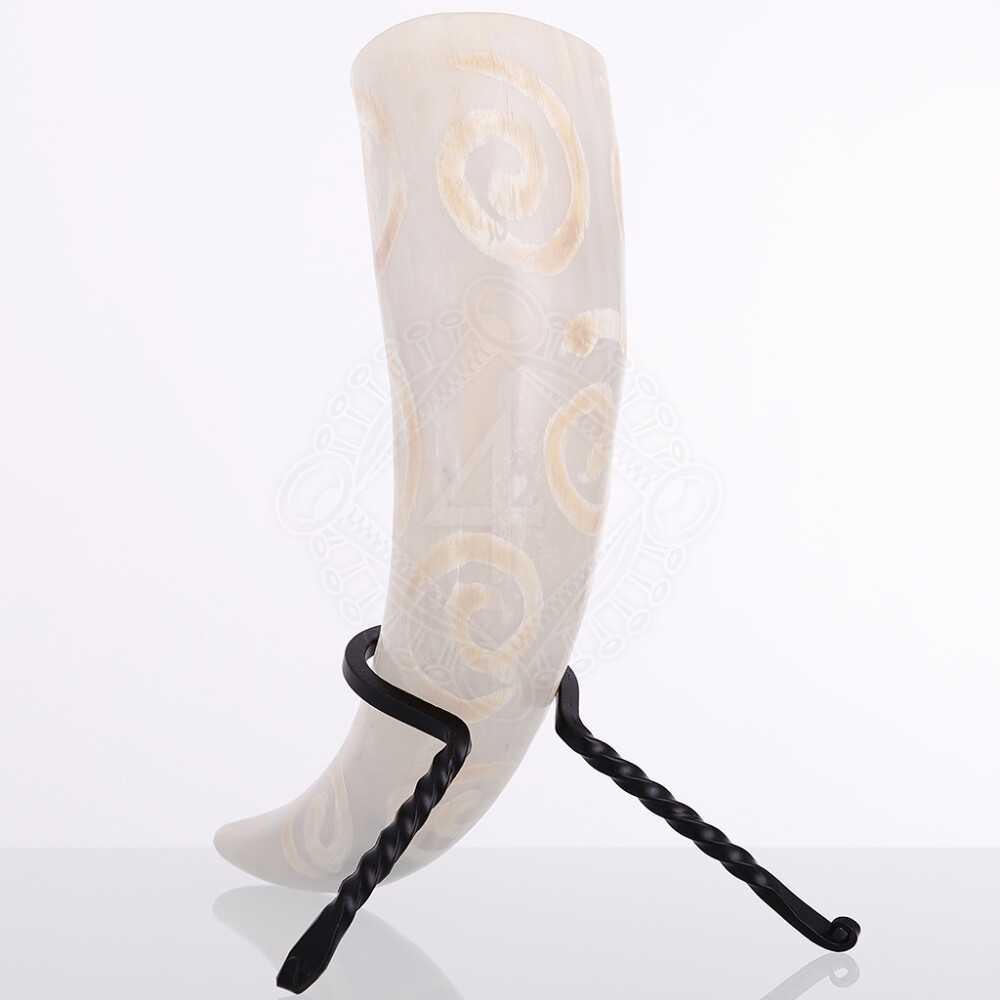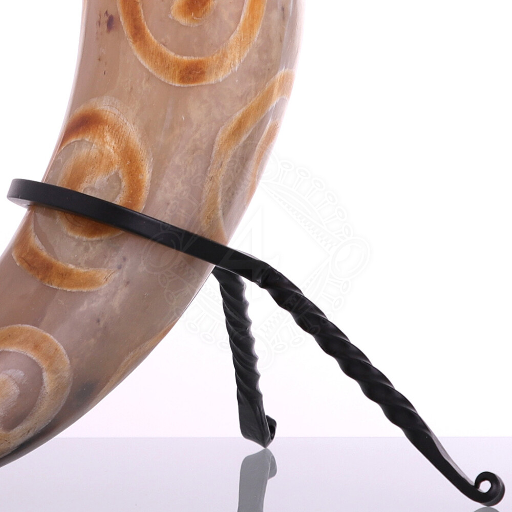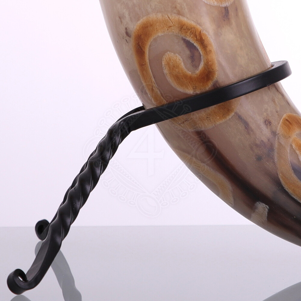 Da der Trinkhornständer (auch Horn Gestell genannt) aus ungehärtetem Baustahl besteht, kann man in der Hand biegen und so die Größe der Öffnung je nach der individuellen Horngröße anpassen.