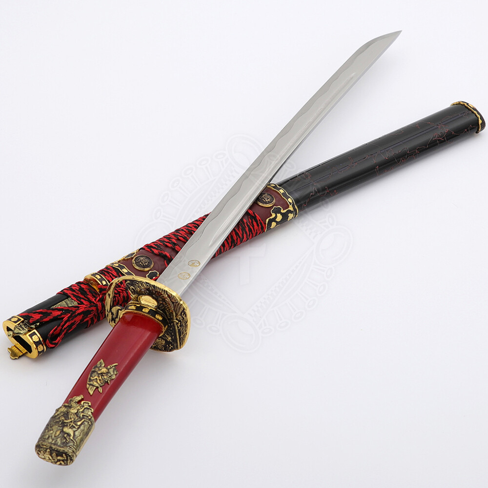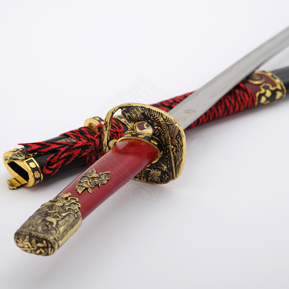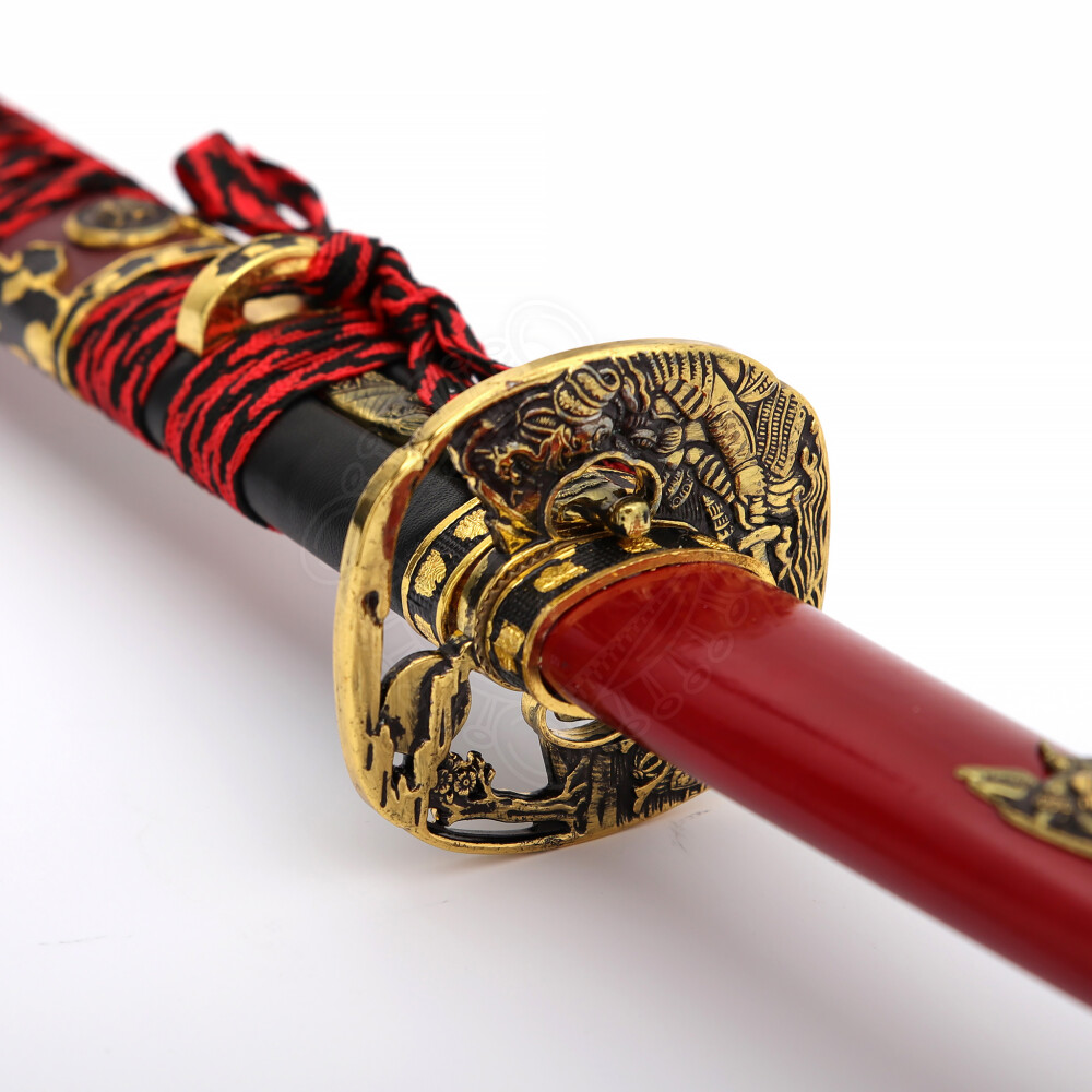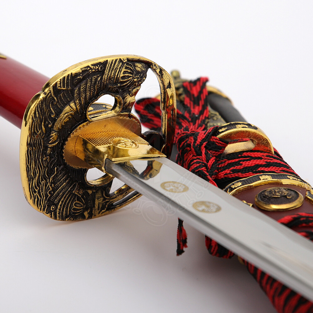 Der Griff aus natürlichem Hartholz ist in einem satten Rot lackiert. Seine glatte Oberfläche ohne die traditionelle Wicklung hebt die goldfarbenen Beschläge – Menuki und Kashira – hervor. Das dominierende Merkmal des Schwertes ist das aufwendige Stichblatt (Tsuba) aus Zamak-Legierung, das Samurai im Kampf darstellt und mit einem markanten Handgelenkschutzbügel (D-Guard) ausgestattet ist, ein für japanische Schwerter sehr ungewöhnliches Element.