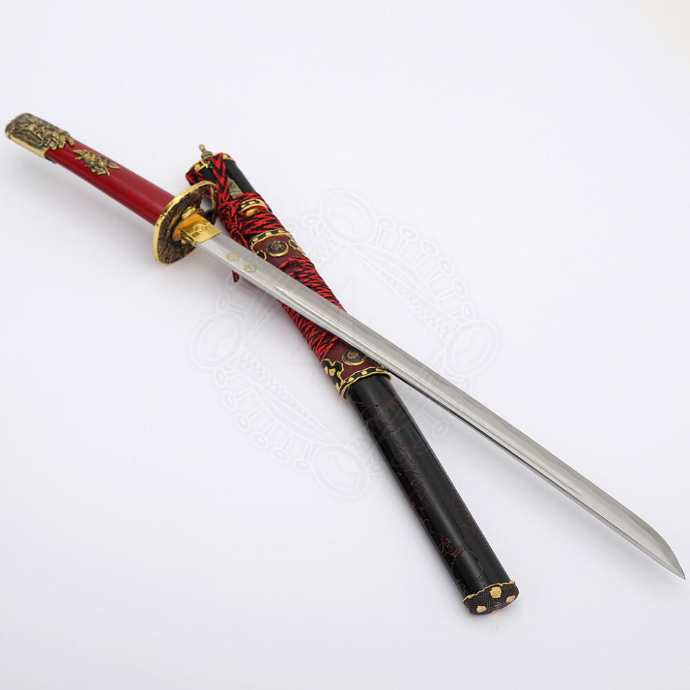 Die Scheide (Saya) aus Aluminium hat eine schwarz polierte Oberfläche mit roten Zeichnungen. Ihr oberer Teil ist mit einer rot-schwarzen Schnur (Sageo) verziert. In der Scheide sind traditionell auch kleine Zubehörteile untergebracht – das Messer Kozuka und die nadelähnliche Kōgai, die das Gesamtbild vervollständigen.