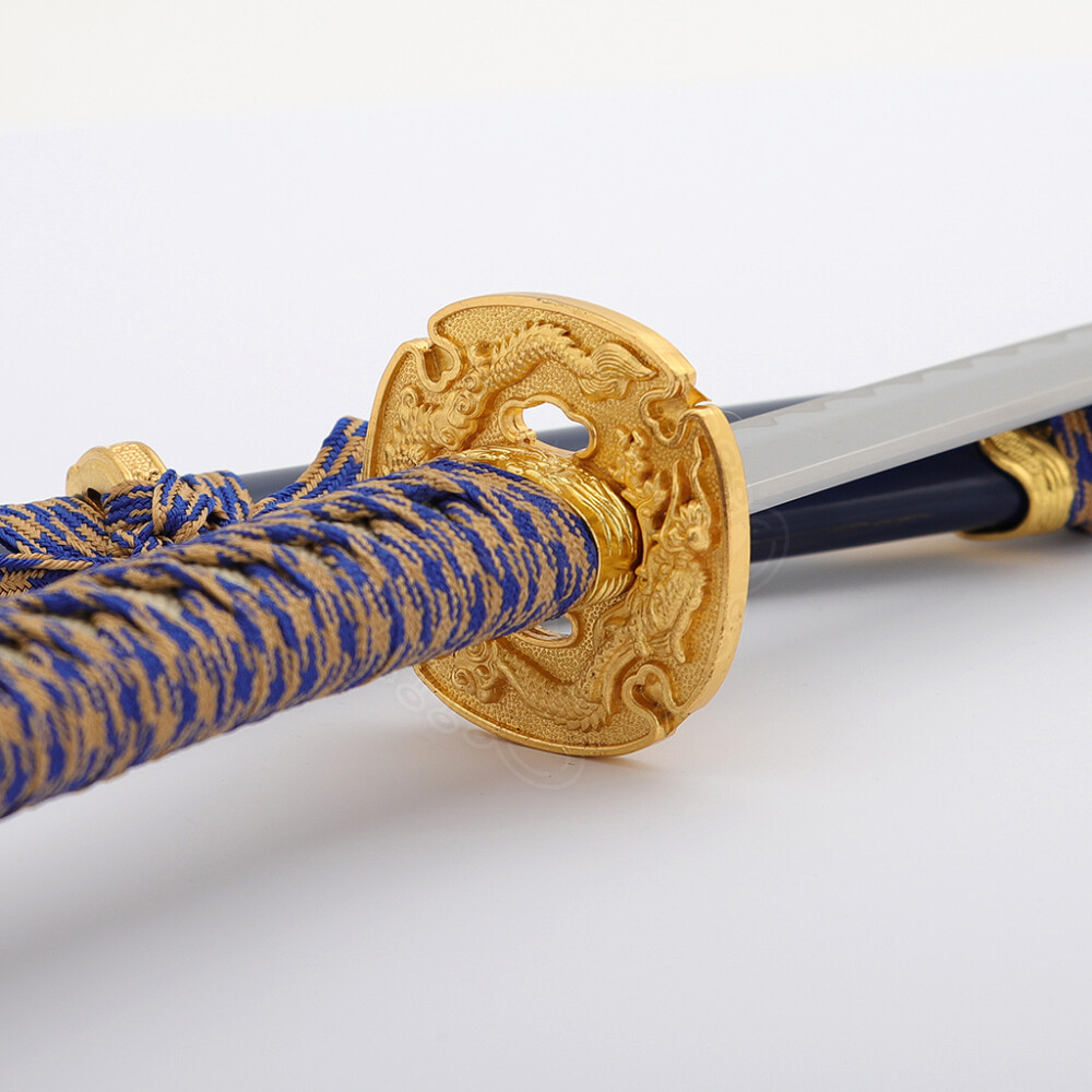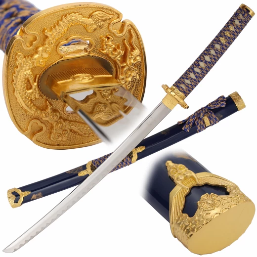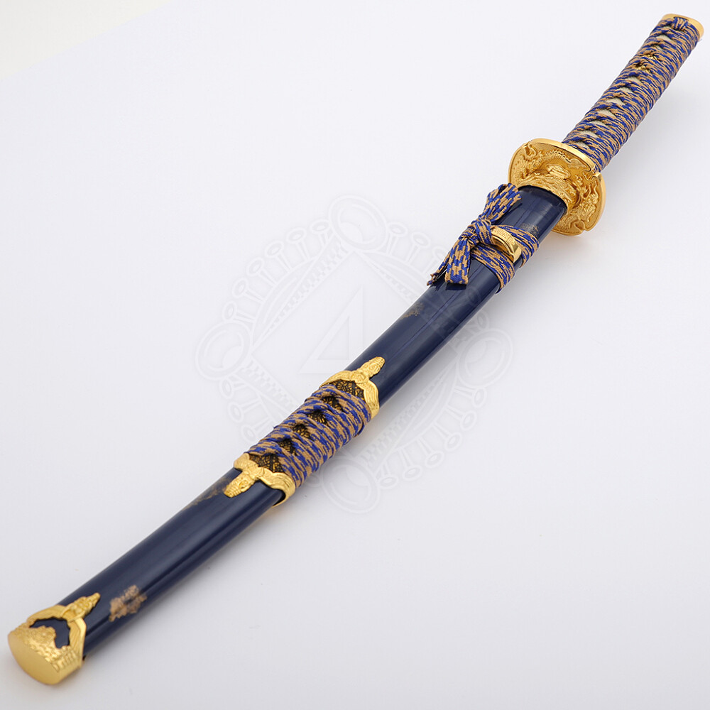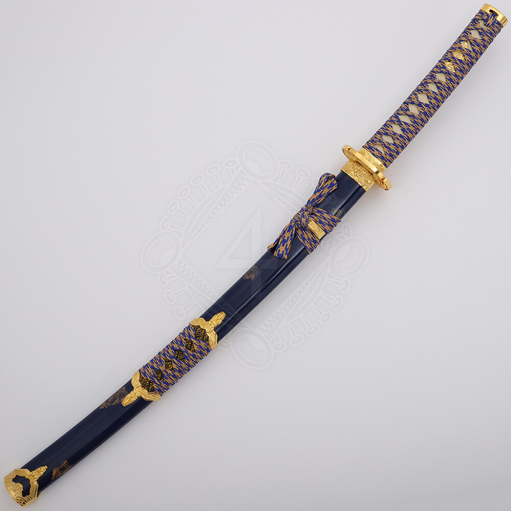 Wakizashi mit blau-güldener Scheide, Tsuba und Kashira gülden
