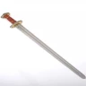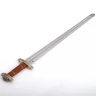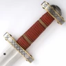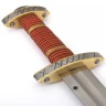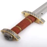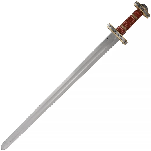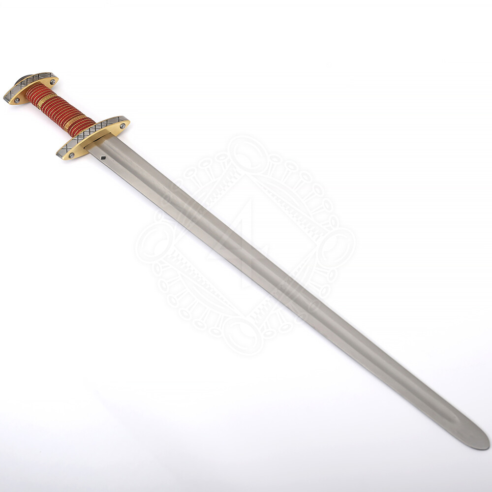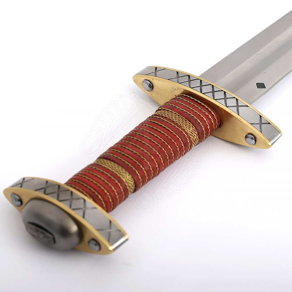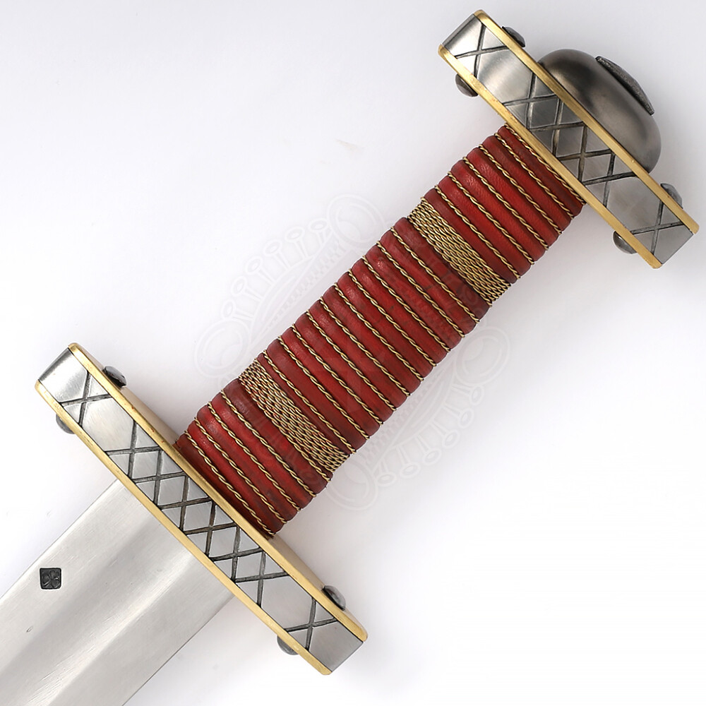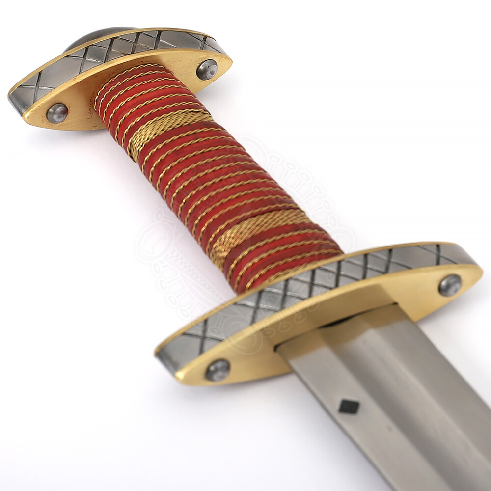 Die Schwertklinge verfügt über eine ausgeprägte Hohlkehle, welche dem Schwert Leichtigkeit verleiht. Sie ist auf die gewünschte Form poliert. Die dekorativen Parierstangen sind jeweils aus drei Teilen gefertigt. Zwei schmale Messingteile und ein dickeres Stahlteil. Das Stahlteil ist durch „X“-Schnitte dekoriert. Die Parierstangen sind nach historischen Modellvorlagen vernietet. Der Knauf ist rund geschleift und vernietet. Der Griff besteht aus einem 5mm Lederband, das rot gebeizt ist. Er ist mit doppelt verdrahtetem Messingdraht verziert, der den Griff dekorativ in 3 Teile verteilt. Das Schwert ist perfekt für historische Nachstellungen und Schaukampf. Zwei Jahre Garantie. Weitere Produktinformationen ...