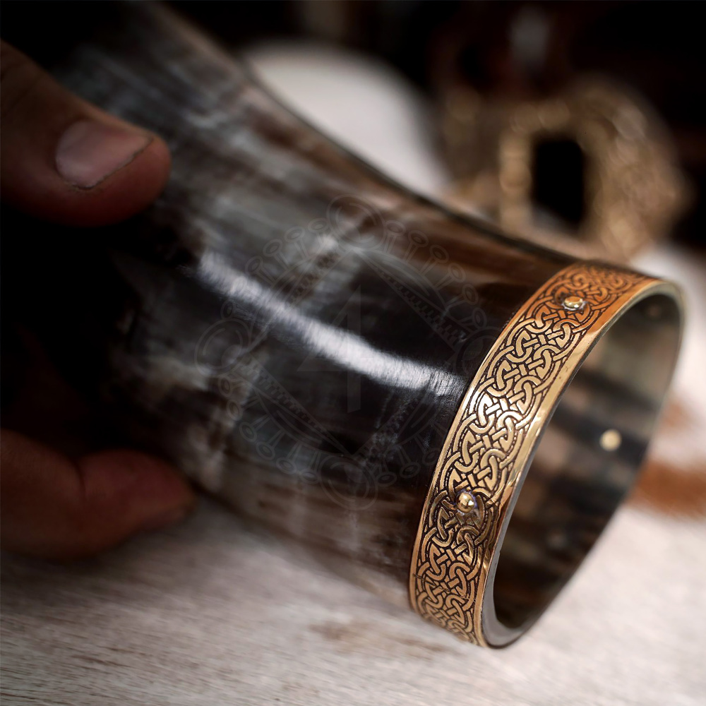 Genieße dein Lieblingsgetränk in echtem historischem Stil mit diesem eleganten Trinkhorn. Dieses handgefertigte Stück aus echtem Naturhorn ist mit massiven Messingbeschlägen verziert, die ein aufwendiges keltisches Muster zeigen, was es nicht nur zu einem funktionalen Gefäß, sondern auch zu einem wunderschönen Sammlerstück macht. Weitere Produktinformationen ...