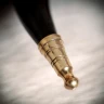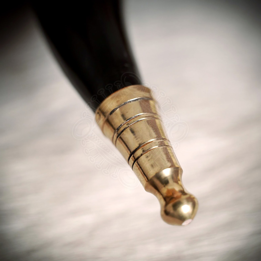 Dieses Wikingerhorn ist ein perfektes Beispiel für die Verbindung von Naturmaterial und handwerklichem Können. Seine Oberfläche ist perfekt poliert und enthüllt die einzigartige Maserung des Horns. Der obere Teil besticht durch eine natürliche Marmorierung in durchscheinenden Beige-, Grau- und Brauntönen, die fließend in eine tiefschwarze Spitze übergeht. Der Rand des Horns ist mit einem breiten Messingring besetzt, der ein detailreich graviertes, endloses keltisches Knotenmuster zeigt. Die Spitze des Horns ist mit einem einfachen, aber eleganten Messingendstück mit rundem Abschluss versehen.