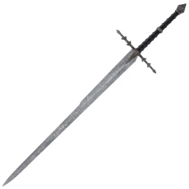 - Griffmaterial: Parierstange und Knauf aus massiven Metall mit versilbertem Antik-Finish und 24K-Blattgold-Verzierungen. Der Knauf ist mit eingravierten Elbenrunen versehen und die Griffwicklung ist aus echtem Leder. Rattenschwanz-Konstruktion der Angel.