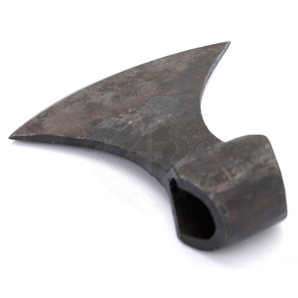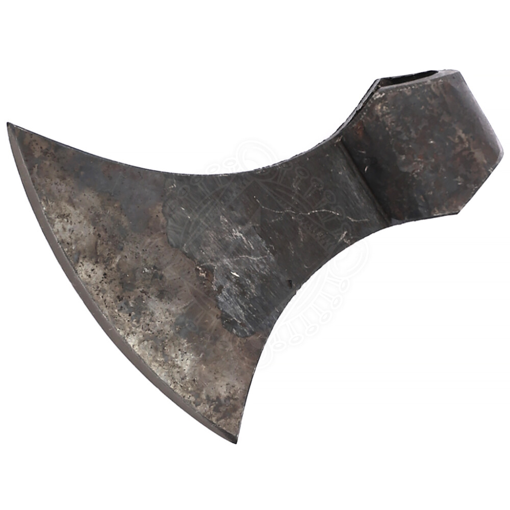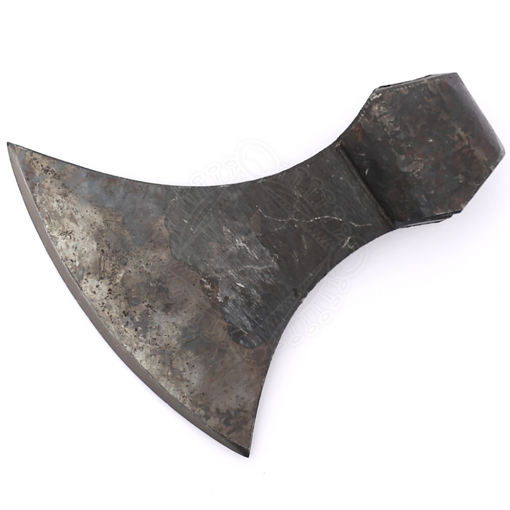 Dieser Axtkopf wurde von Hand aus kohlenstoffreichem Stahl geschmiedet, was ihm eine außerordentliche Haltbarkeit und die Fähigkeit verleiht, seine Schärfe lange zu halten. Die dunkle, rustikale Oberfläche mit sichtbaren Schmiedespuren verleiht ihm ein authentisches Aussehen, während die Schneide selbst präzise geschliffen ist. Er ist die ideale Basis für die Herstellung einer voll funktionsfähigen Einhandaxt.