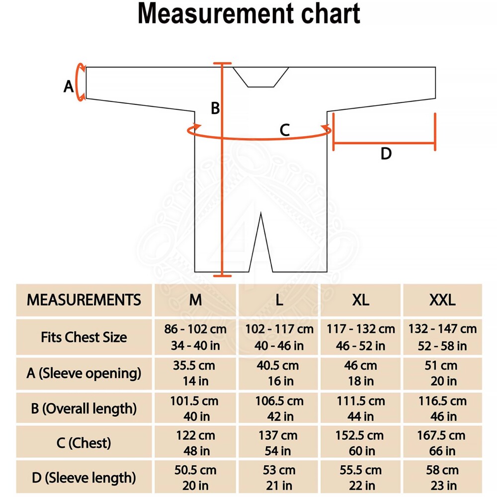 Das Kettenhemd schützt Deine Arme, Deine Brust, Deinen Rücken sowie die oberen Oberschenkel. Das Geflecht besteht aus abwechselnden Reihen von Flachringen aus Baustahl. In der untenstehenden vollständigen Größentabelle haben wir die fehlenden Werte für die Größen M und XXL basierend auf den Herstellerdaten geschätzt und ergänzt, damit Du einen perfekten Überblick hast.