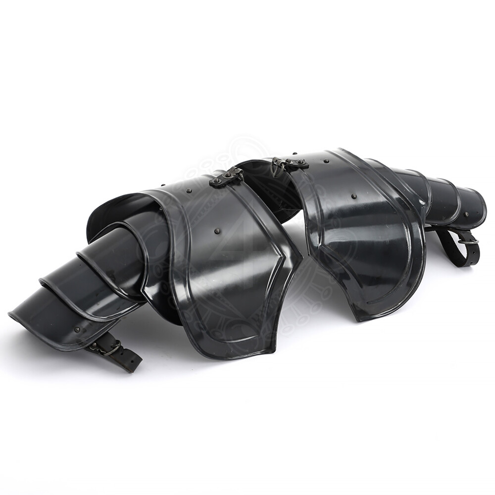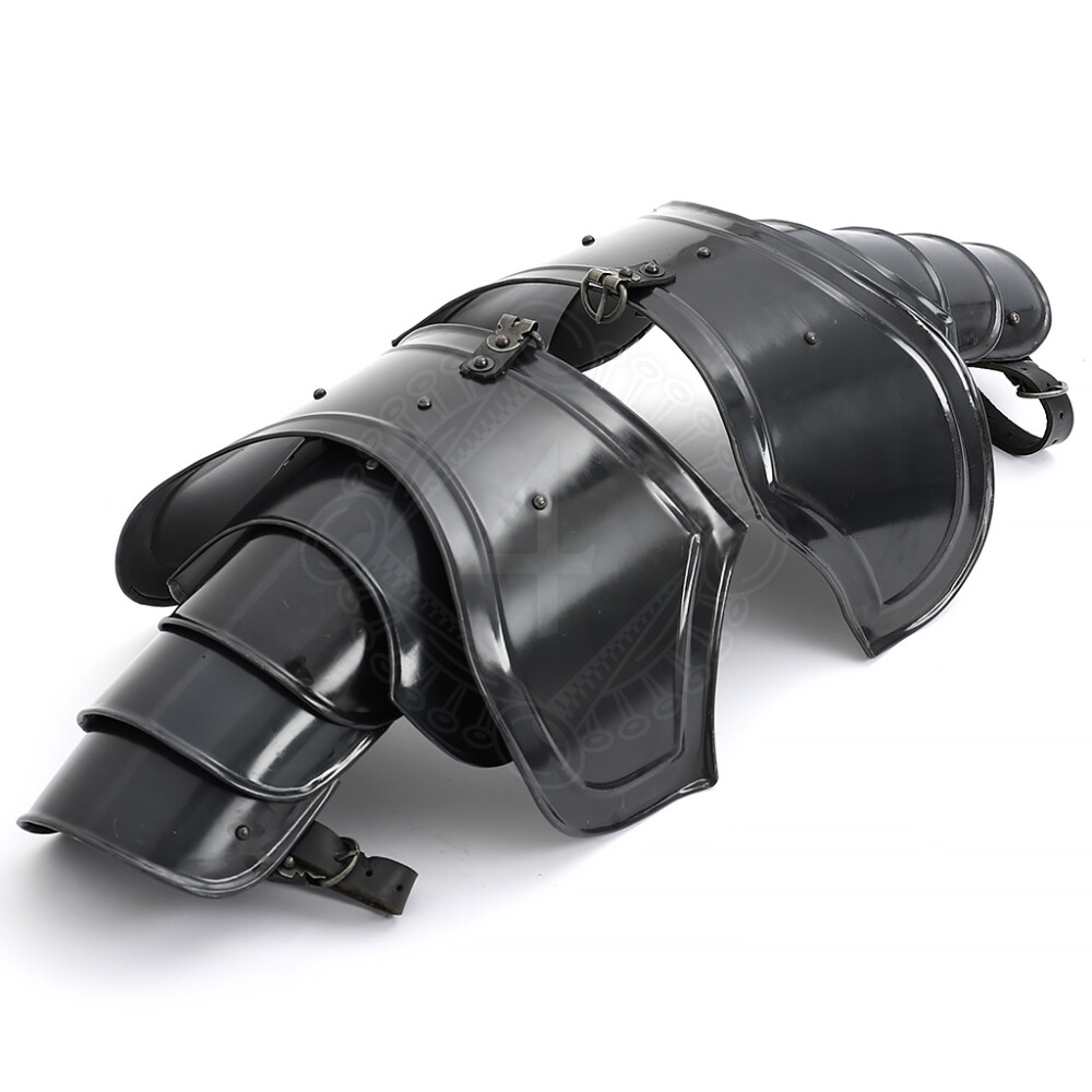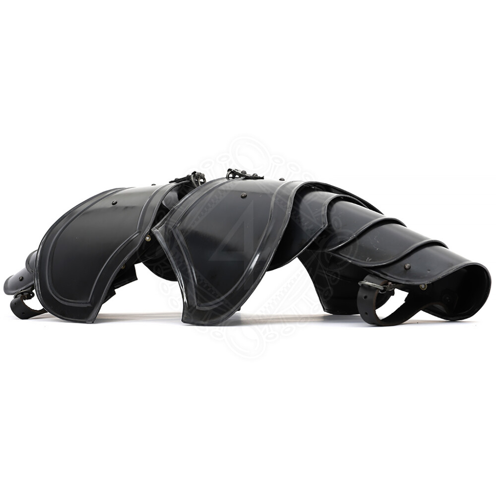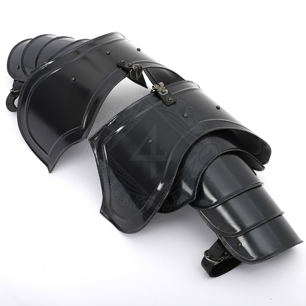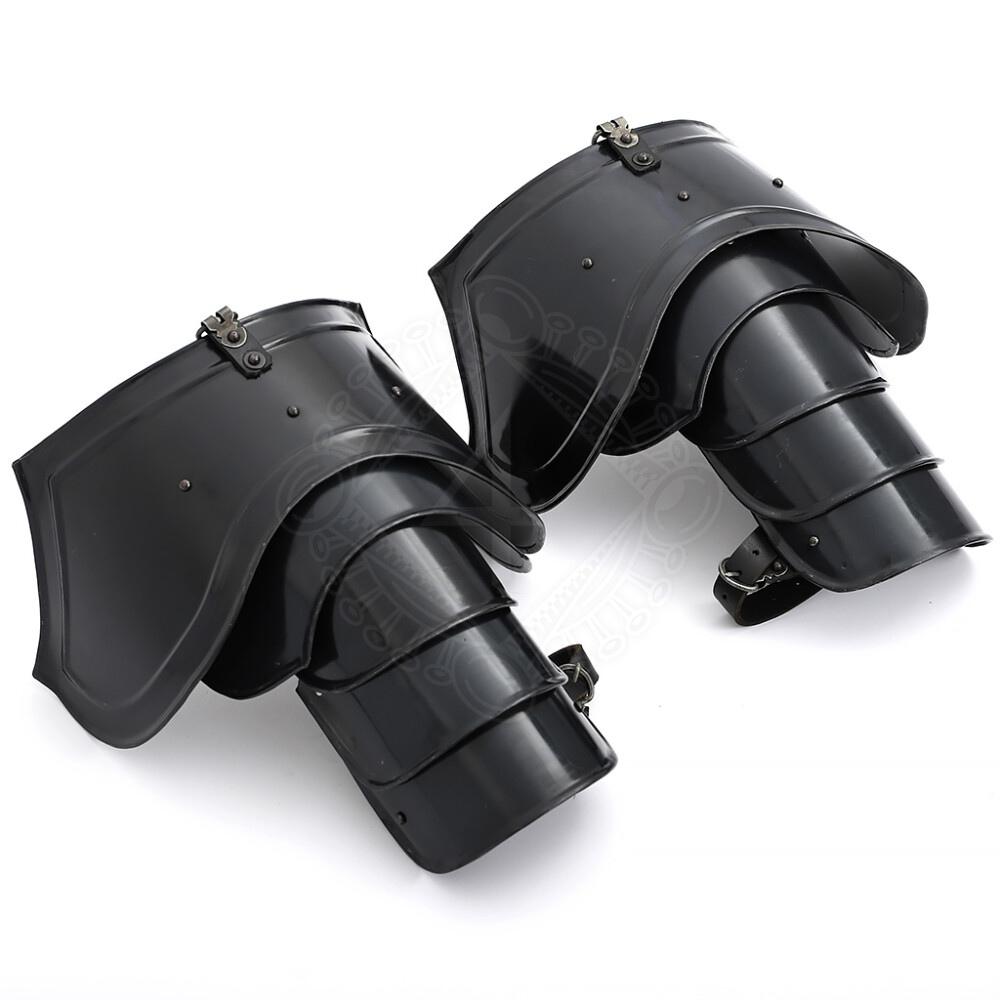 Diese Schulterpanzer sind mit Blick auf Praktikabilität und Stil entworfen. Sie bestehen aus mehreren gelenkig verbundenen Platten (Lamellen), die eine hervorragende Flexibilität und Bewegungsfreiheit ermöglichen. Die obere, größte Platte bedeckt das Schultergelenk, während die angrenzenden kleineren Platten den Oberarm schützen. Die geschwärzte Oberfläche sieht nicht nur bedrohlich und elegant aus, sondern bietet auch einen grundlegenden Korrosionsschutz.