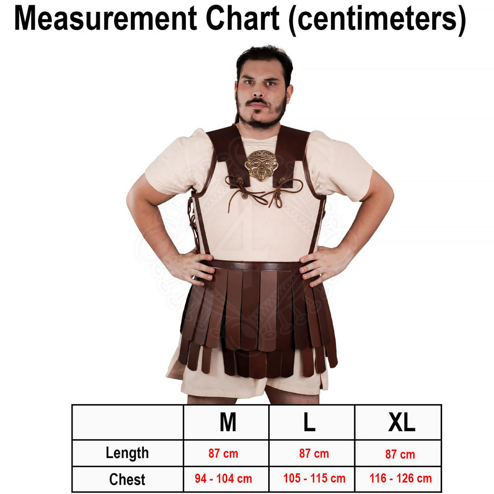 Das zentrale Element auf der Brust ist ein markantes Emblem aus Messing, das das Haupt der Gorgone Medusa (Gorgoneion) zeigt. Im antiken Griechenland diente dieses Symbol als Apotropaion – ein magischer Schutz, der das Böse abwehren und Feinde erschrecken sollte. Die seitliche Schnürung erfolgt über Lederbänder und dekorative Messingringe mit Blumenmotiv, was eine leichte Größenregulierung und Anpassung an deine Figur ermöglicht.