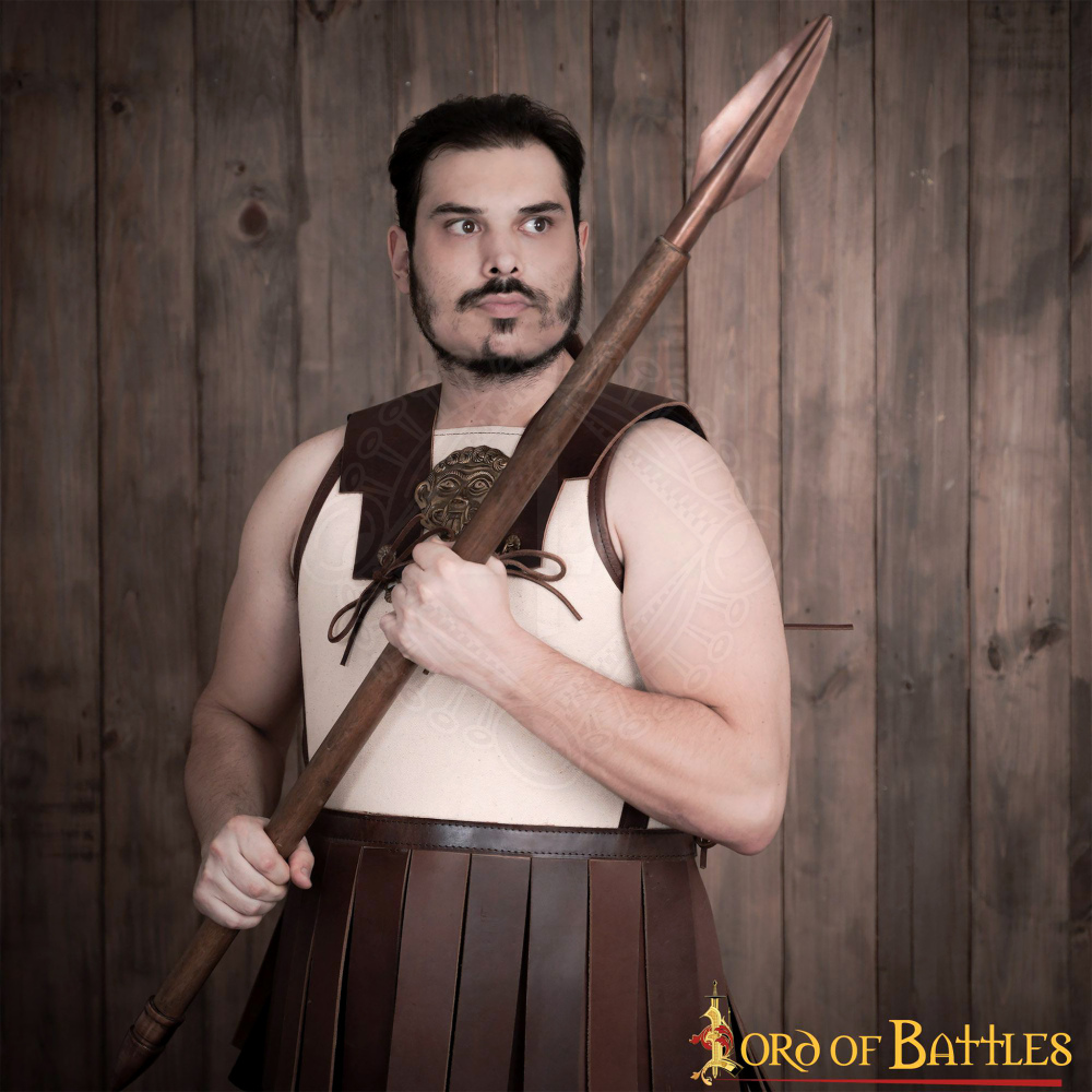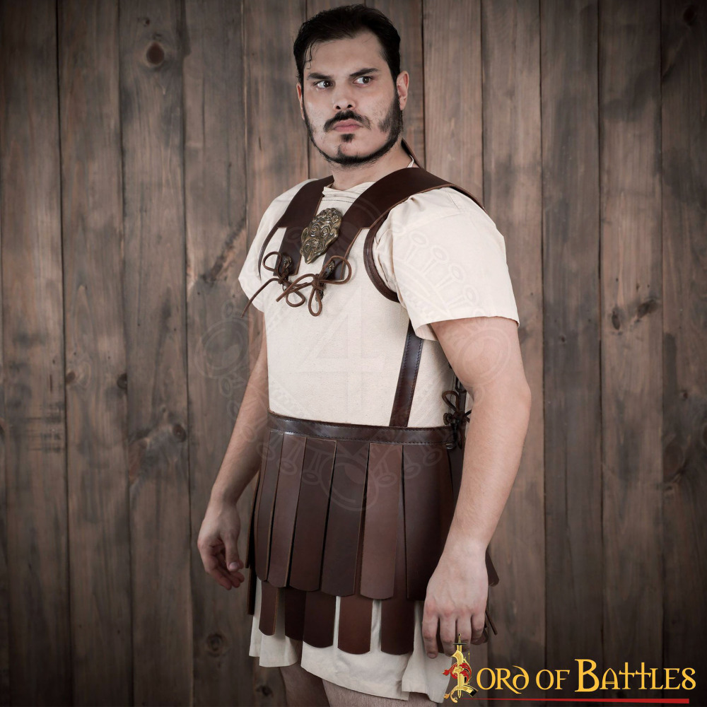 Der Aufbau der Rüstung folgt treu den historischen Vorbildern. Der Torso wird durch das feste Gewebe geschützt, während der untere Teil mit Lederstreifen, den sogenannten Pteryges, versehen ist. Diese „Flügel“ schützen den Unterleib und die Oberschenkel, ohne beim Gehen oder Laufen zu behindern. Die Schulterstücke (Joch) werden vom Rücken nach vorne gezogen und auf der Brust fixiert – ein charakteristisches Merkmal dieser antiken Rüstung.