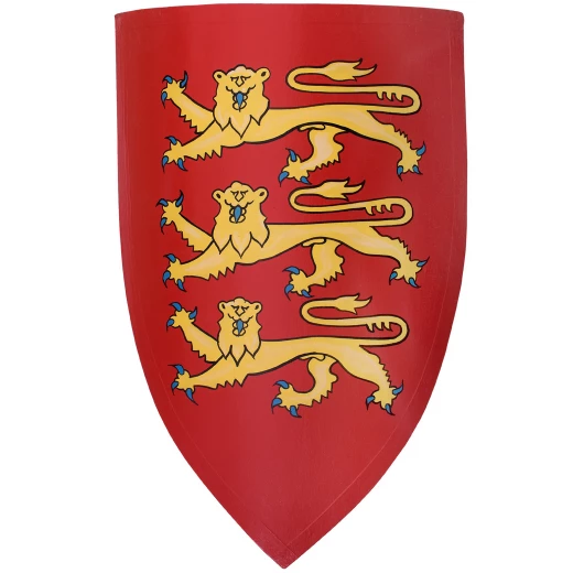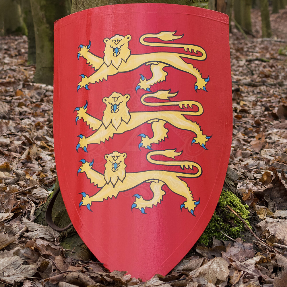 Der mittelalterliche Schild, den wir hier anbieten, zeigt das königliche Wappen Englands, wie es im Hochmittelalter über einen Zeitraum von etwa 170 Jahren (mit kurzen Unterbrechungen) von den englischen Monarchen verwendet wurde. Es besteht aus drei identischen, schreitenden Löwen - sog. lions passants guardants - in Gold mit blauen Zungen und Klauen, auf karminrotem Hintergrund. Weitere Produktinformationen ...