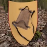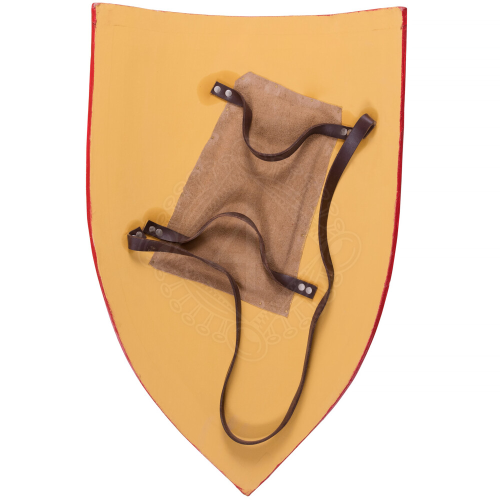 Dieser heraldische Schild weist die typischen Merkmale der Wappenschilde auf, die im Hochmittelalter (ca. 12. bis 14. Jh.) gebräuchlich waren - eine Dreiecks- oder V-Form, eine flache Oberseite und abgerundete Seiten, die nach unten hin spitz zulaufen. Er ist aus Sperrholz gefertigt, mit Leinen straff bespannt und handbemalt. Die gelb gestrichene Rückseite des Schildes ist mit zwei sog. Schildfesseln (Halteriemen/Armschlaufen) und einem längeren Schulterriemen aus kräftigem, stabilem Leder versehen, die mit Stahlnieten fest in Position fixiert sind. Für besseren Schutz gegen Stoß- und Schlageinwirkungen sorgt eine Lederpolsterung, die in Armhöhe mit Nägeln befestigt ist.