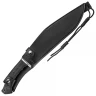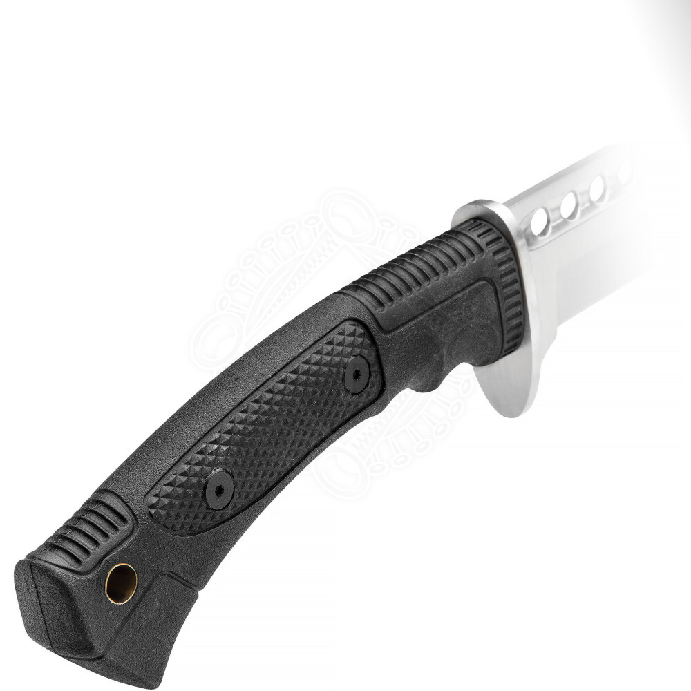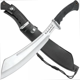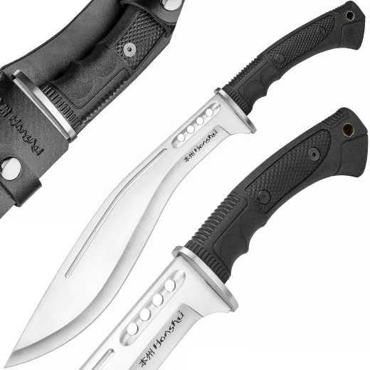 Der Griff aus modernstem TPR ist robust und wasserfest, mit ergonomischen Konturen und Texturen, die für rutschfreien Halt sorgen. Das taktische Kukri hat eine Gesamtlänge von ca. 49,8cm und wird in einer hochwertigen, verstärkten Gürtelscheide aus Echtleder geliefert.