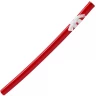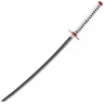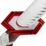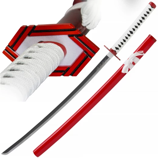 Ein unübersehbares Element ist das sechseckige Stichblatt (Tsuba) in einer Kombination aus Dunkelrot und Schwarz, das das Erkennungszeichen von Giyu Tomioka ist. Im Lieferumfang enthalten ist auch eine Scheide (Saya) aus robustem Kunststoff in einem satten Rotton, verziert mit einer einfachen weißen Wicklung, genau wie du es vom Bildschirm kennst.