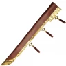 Die schöne Scheide ist aus vegetabil gegerbtem, von Hand gefärbtem Leder gefertigt und mit stilechten Messingbeschlägen verziert. Dank dreier an Messingringe angebrachten Lederschlaufen lässt sich das Messer im typischen Wikingerstil horizontal am Gürtel tragen. Für die stilisierten Details der Scheide dienten ebenfalls Originalfunde aus Birka als Vorbild.