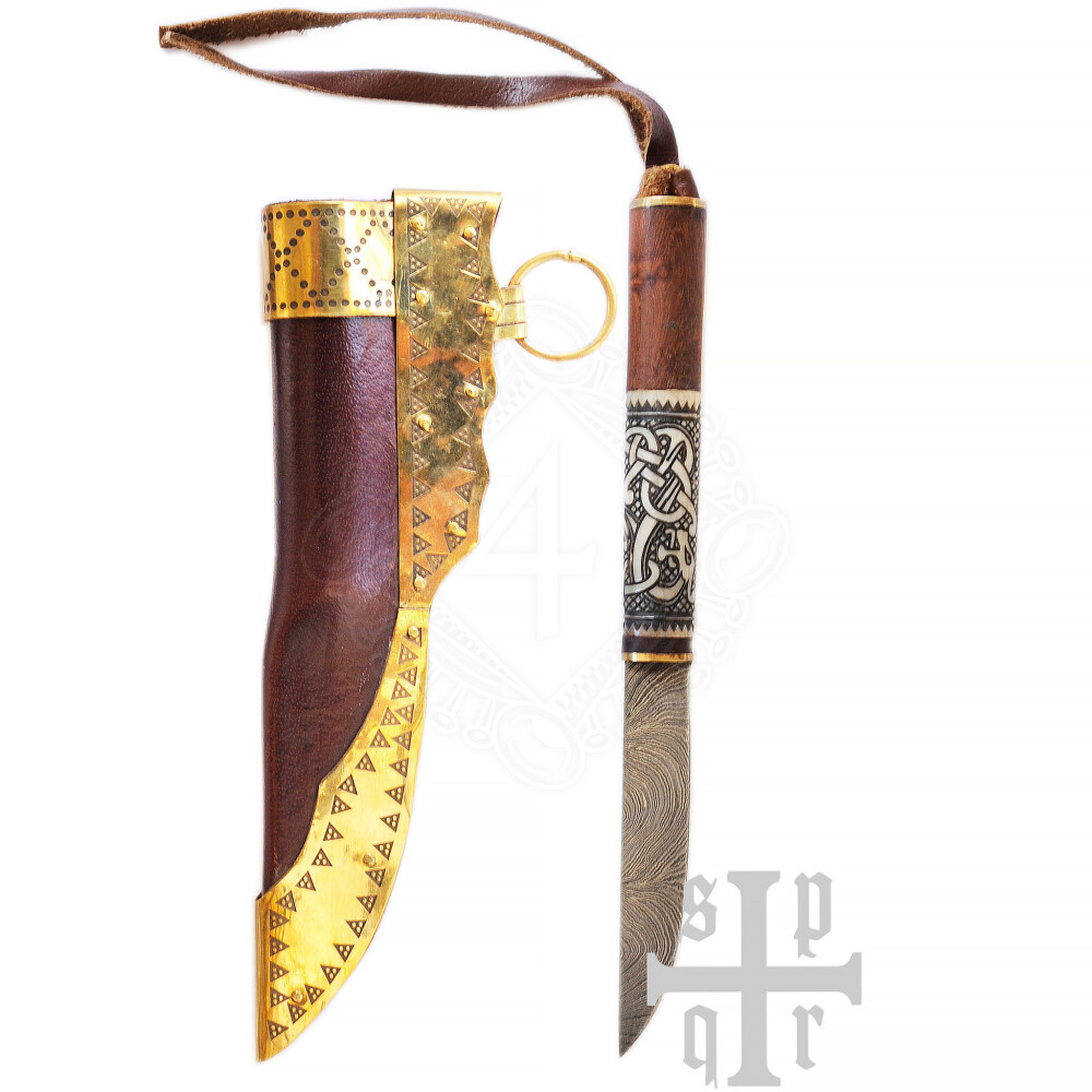 Dieses handgefertigte wikingerzeitliche Messer besitzt eine Klinge aus 256-Lagen-Damaststahl*. Der Holzgriff ist ein wahrer Hingucker: Das Vorderteil ist aus Knochen gefertigt und auf jeder Seite mit einem schönen Motiv der Midgardschlange verziert. Zur Klinge hin schließt der Griff mit einer Zwinge aus Messing ab, und am anderen Ende hat die Griffkappe aus Messing eine praktische Öse (zur Aufnahme eines Tragebands oder zum bequemen Herausziehen des Messers aus der Scheide). Die wunderschöne Scheide aus gegerbtem Leder mit reich verzierten Messingbeschlägen ist mit einem Tragering ausgestattet. So lässt sich das Wikinger-Messer bequem am Gürtel tragen. Weitere Produktinformationen ...