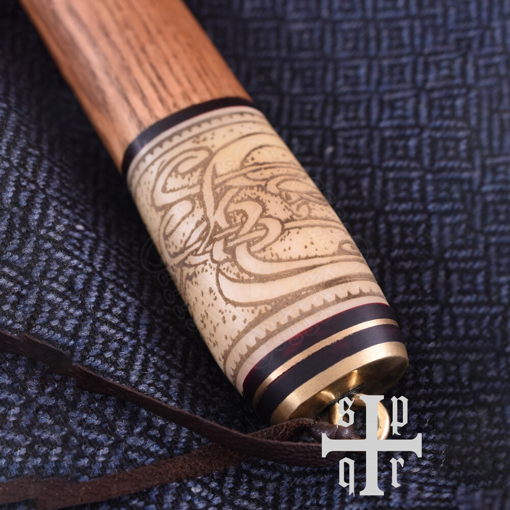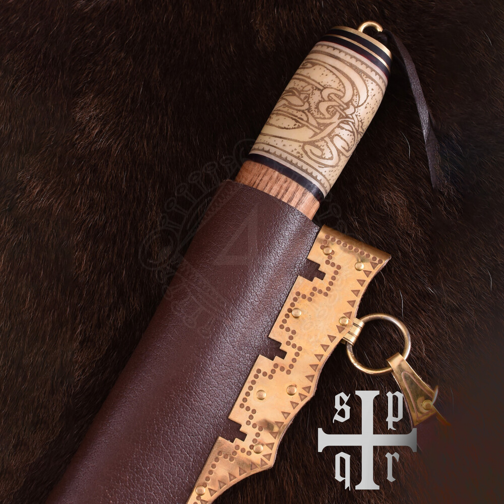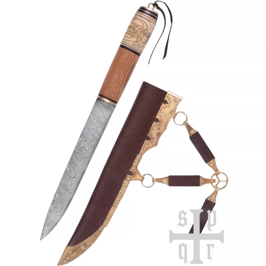 Dieses handgefertigte wikingerzeitliche Messer (Sax) besitzt eine scharfe Klinge aus 256-Lagen-Damaststahl. Das untere Drittel des Holzgriffes besteht aus Knochen und ist mit einem schönen Knotenmuster verziert. Griff-Endkappe und -Zwinge sind aus Messing gefertigt. Zum Lieferumfang gehört eine wunderschöne Scheide aus gegerbtem Leder mit reich verzierten Messingbeschlägen. Das Tragesystem besteht aus zwei Trageringen, einem Riemenverteiler und drei Lederriemen. In der Wikingerzeit waren Tragesysteme dieser Art weit verbreitet. Der Riemenverteiler diente dazu, die einzelnen Riemen so zu verteilen, dass das Schwert, bzw. das Saxmesser für ein schnelles Herausziehen aus der Scheide in einem optimalen Winkel am Gürtel getragen werden konnte. Weitere Produktinformationen ...